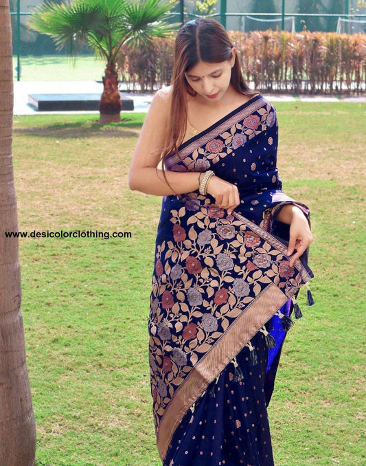 Blue And Pink Banarasi Silk Woven Saree With Tassels
