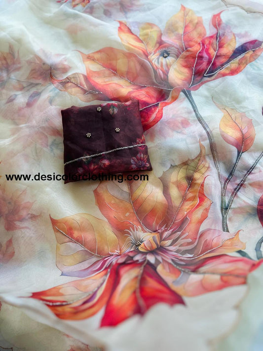 Semi Pure Organza Saree with Handcrafted Work and Printed Blouse