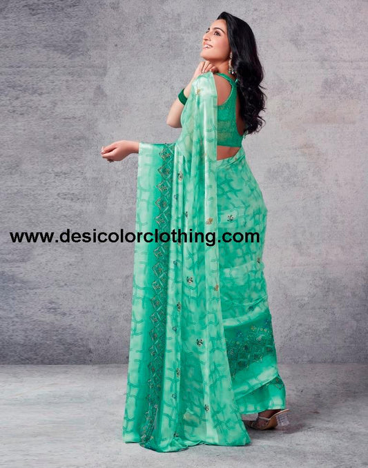 Turquoise Coloured Poly Silk Printed Partywear saree