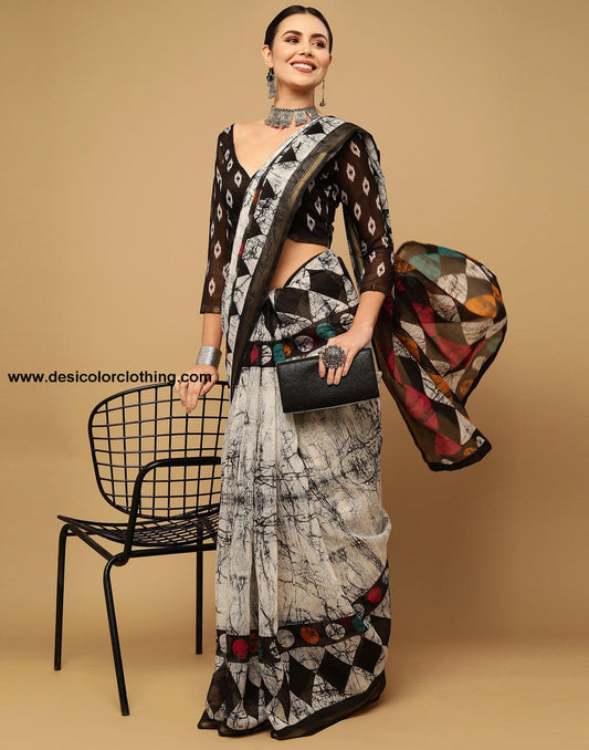 White Cotton Printed Saree