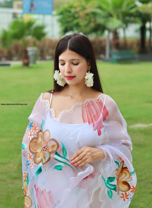 Beautiful Hand-Painted Organza Silk Saree – A Blend of Artistry and Elegance