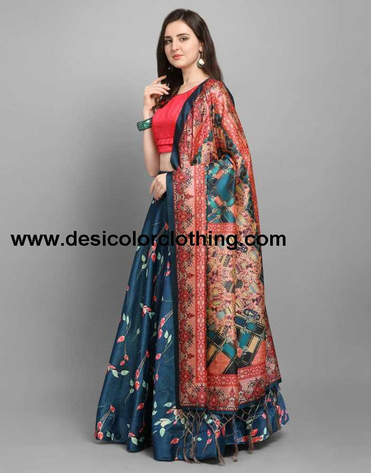 Beautiful Peacock Blue Coloured Poly Silk Digital Printed Casual Wear Lehenga