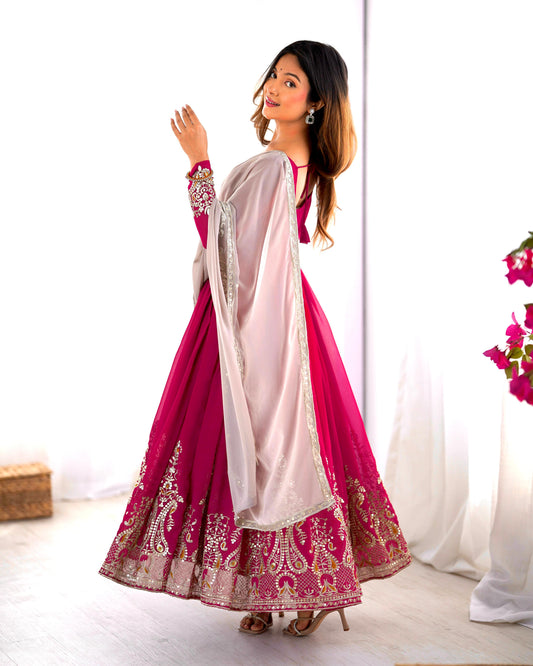 Exquisite Cinon Silk Gown-Jacket Set for Festive and Wedding Wear