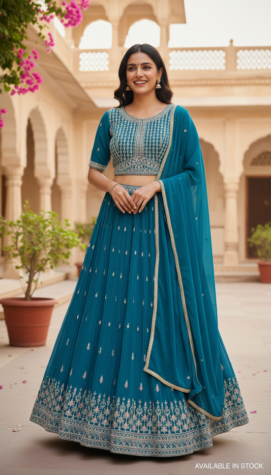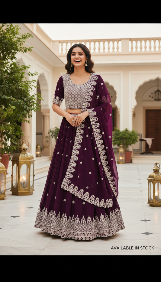A Full Stitched Lehenga is a fully tailored outfit designed for a perfect fit and ease of wear. It features a pre-stitched skirt that often showcases vibrant colors like rich reds, royal blues, deep greens, and soft pastels. The lehenga is typically embellished with intricate embroidery, sequins, or traditional motifs, enhancing its visual appeal.