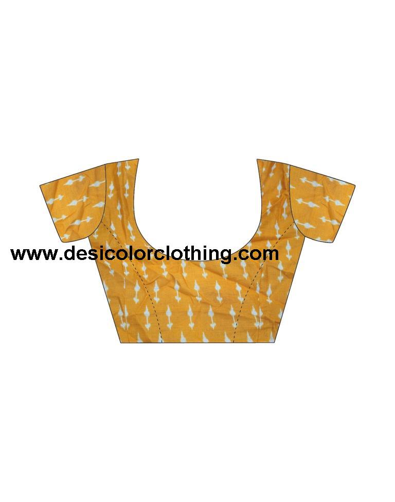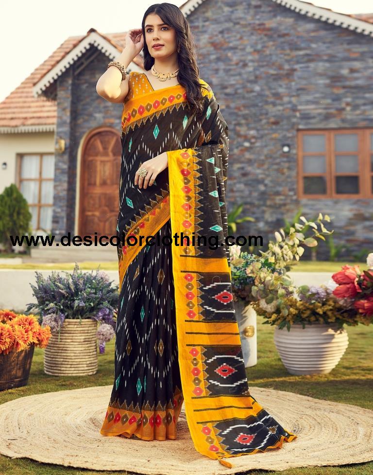 Blouse Color:Turmeric Blouse Fabric:Cotton Blouse Length:0.70 Mtr Blouse Work:Printed Saree Color:Black Saree Fabric:Cotton Saree Length:5.30 Mtr Saree Work:Printed, Tassels, Ready To Wear
