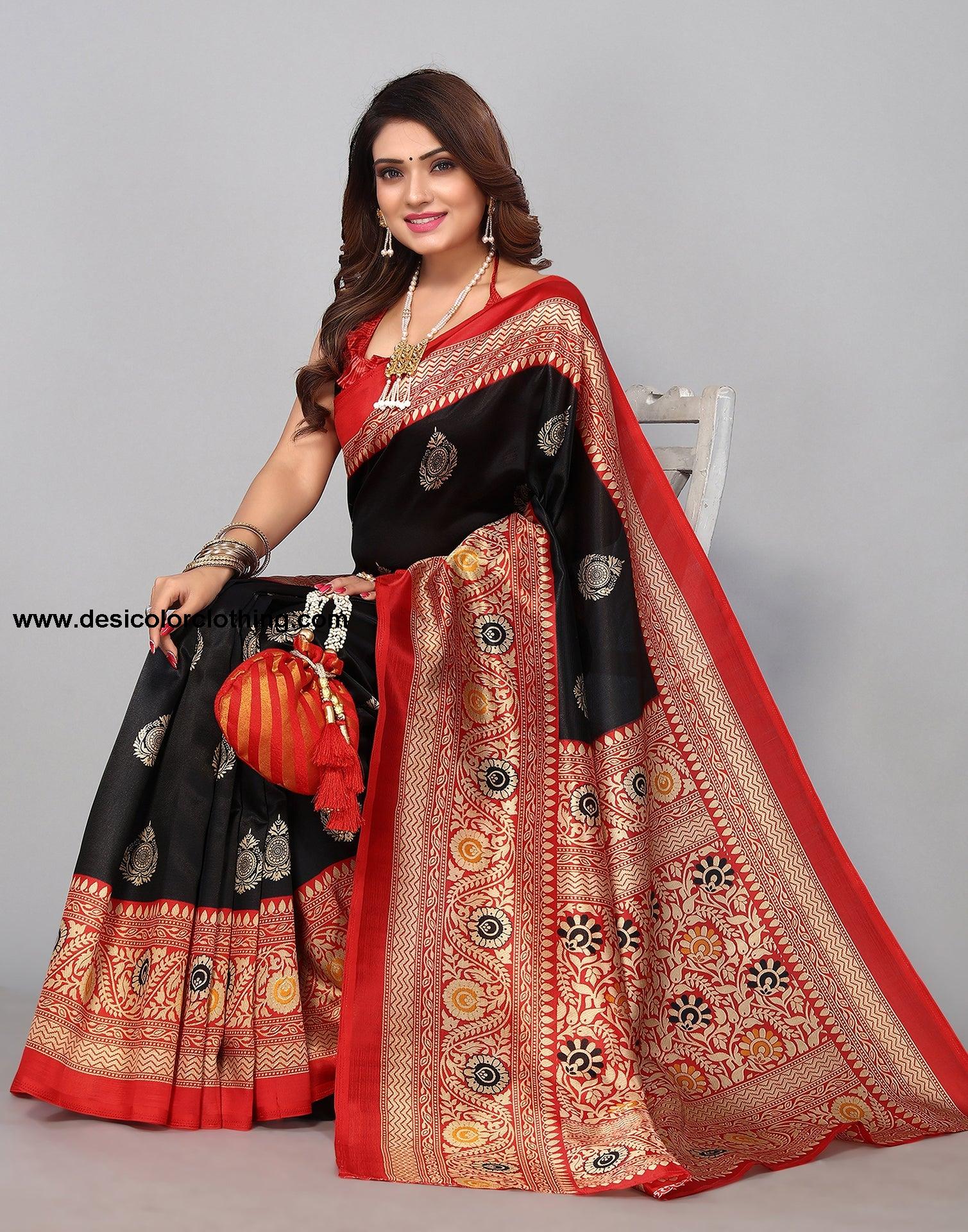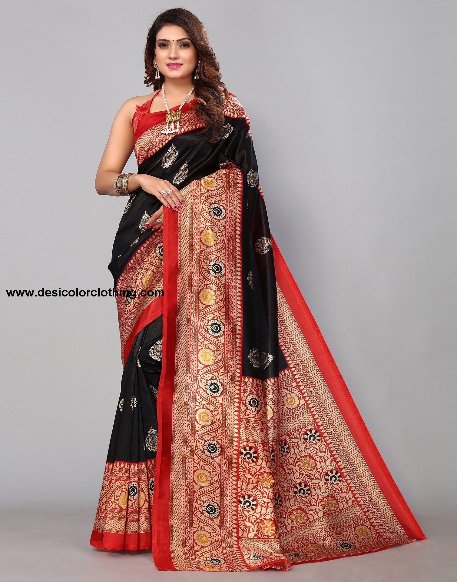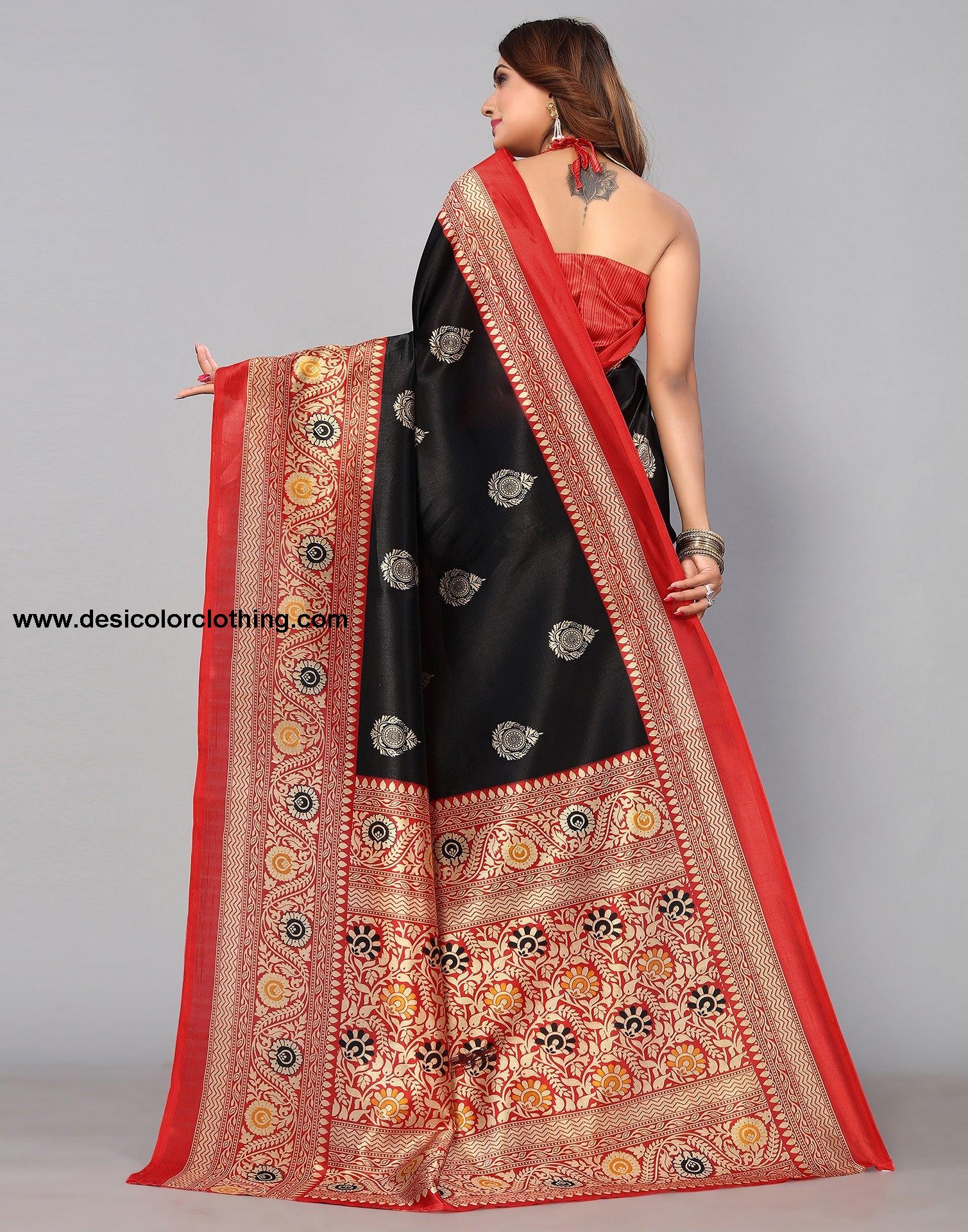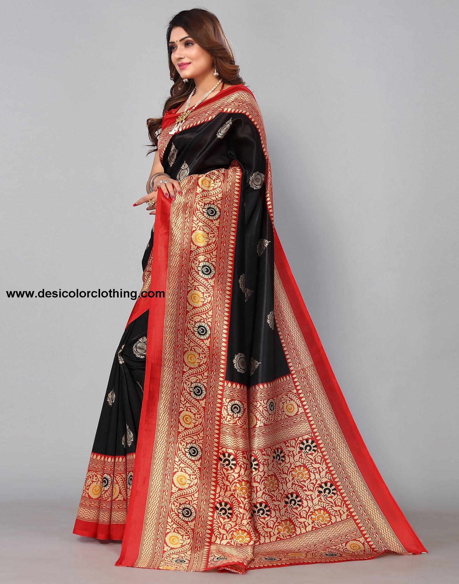 Blouse Color:Red Blouse Fabric:Poly Silk Blouse Length:0.70 Mtr Blouse Work:Printed Saree Color:Black Saree Fabric:Poly Silk Saree Length:5.30 Mtr Saree Work:Printed Type:Printed