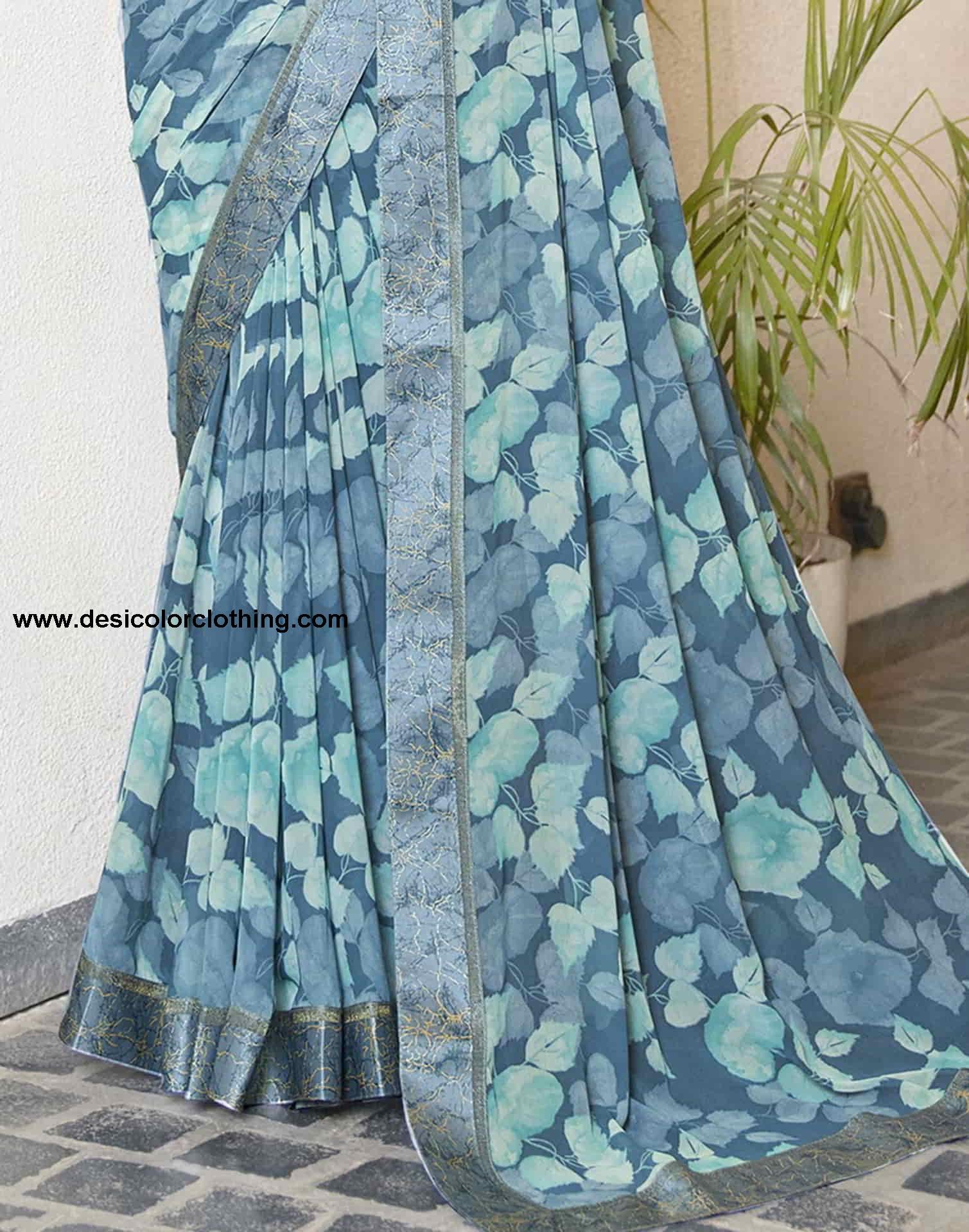 Blouse Color:Blue, Golden Blouse Fabric:Satin Blouse Length:0.80 Mtr Blouse Work:Printed, Foil Print, Lace Saree Color:Blue, Turquoise Saree Fabric:Georgette Saree Length:5.50 Mtr Saree Work:Floral Printed, Lace