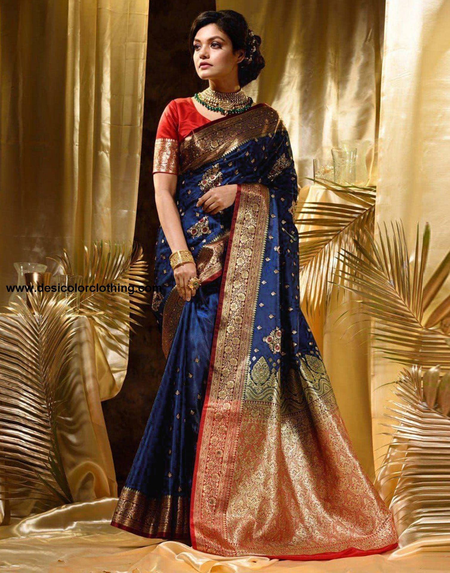Blouse Color:Red, Golden Blouse Fabric:Art Silk Blouse Length:0.80 Mtr Blouse Work:Plain, Jacquard Border Saree Color:Blue, Golden Saree Fabric:Art Silk Saree Length:5.50 Mtr Saree Work:Jacquard