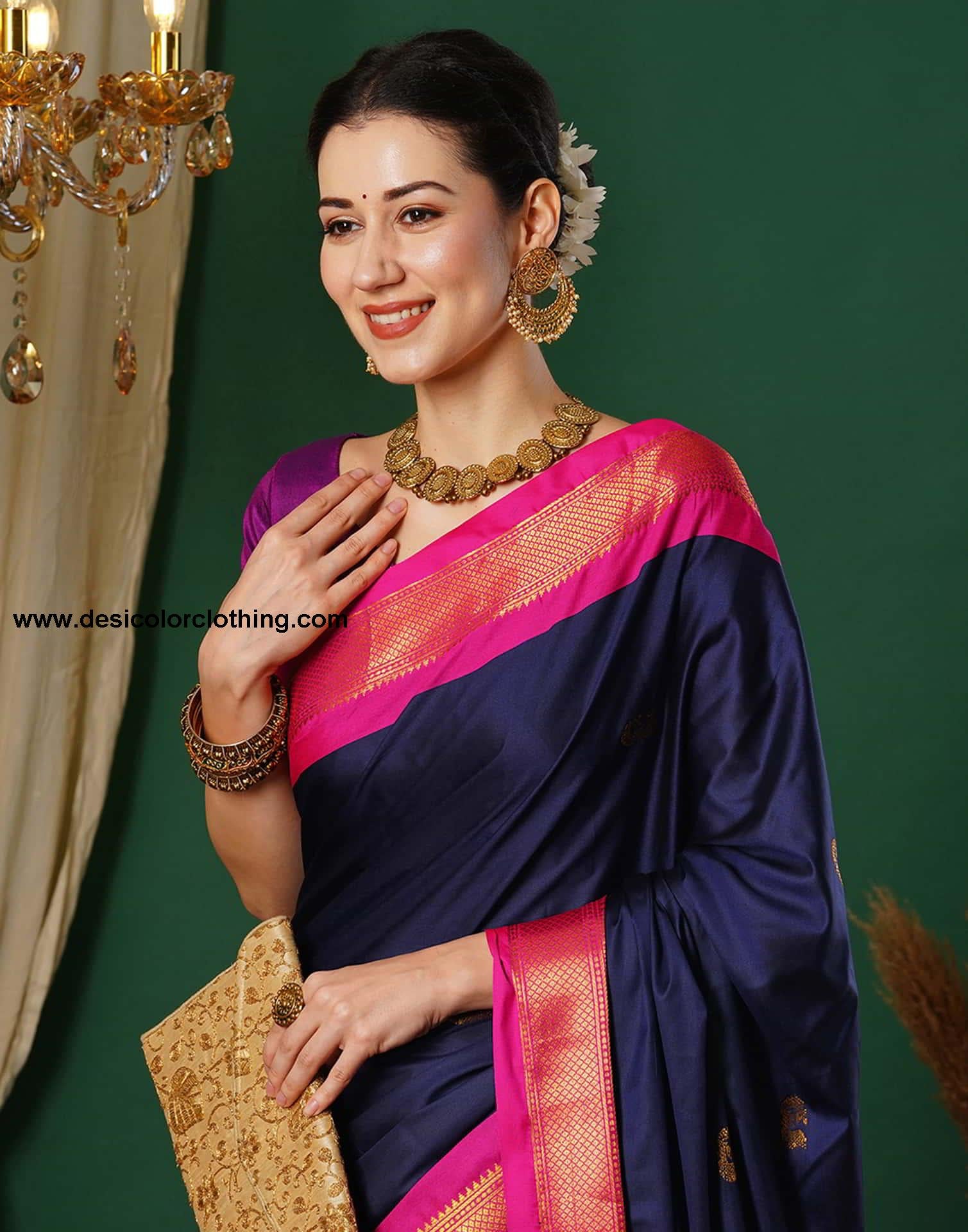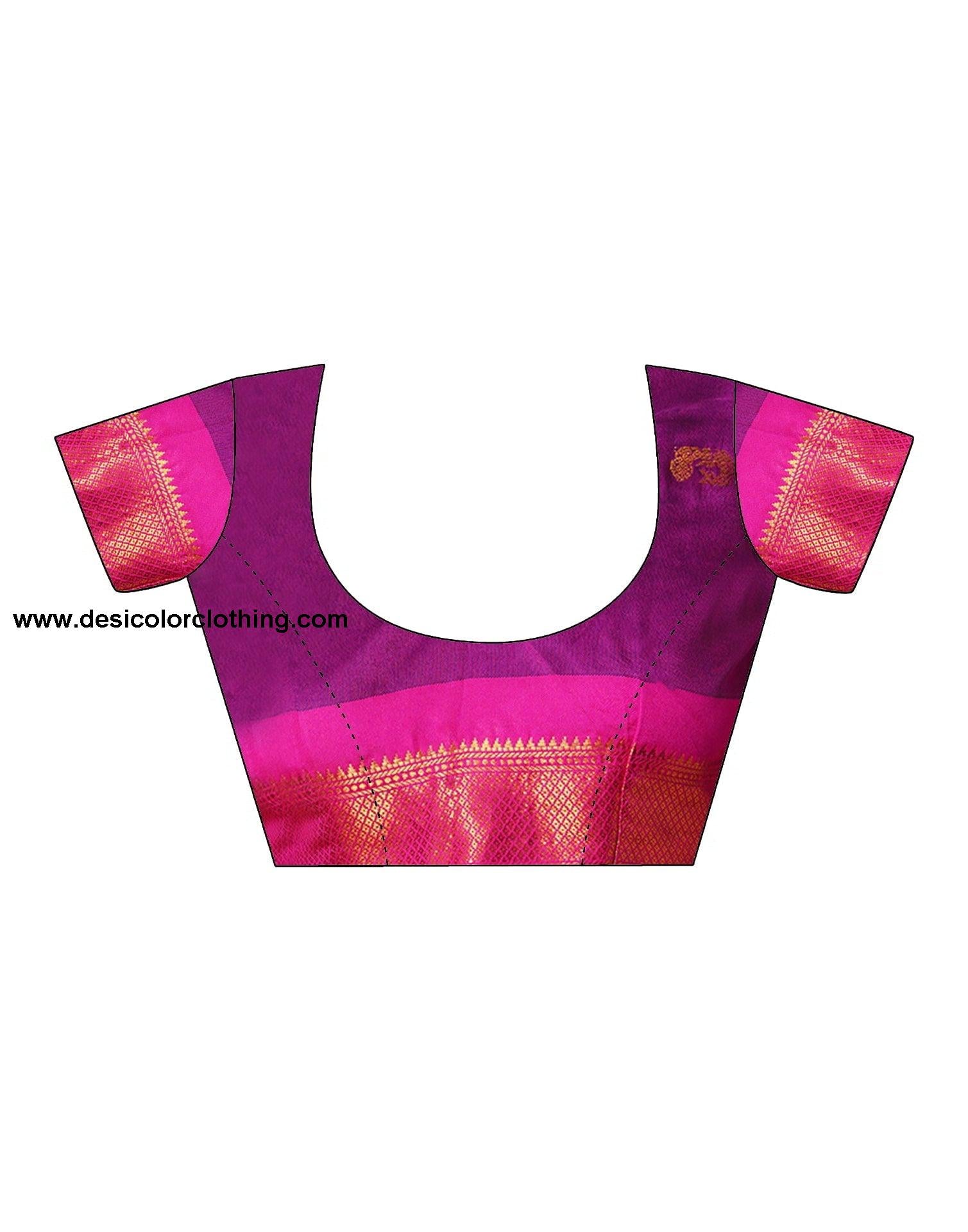 Blouse Color:Magenta Blouse Fabric:Silk Blouse Length:0.80 Mtr Blouse Work:Woven Border (Dual Tone ) Saree Color:Navy Blue, Rani Pink, Magenta, Golden Saree Fabric:Silk Saree Length:5.50 Mtr Saree Work:Woven, Tassels Type:Kanjivaram