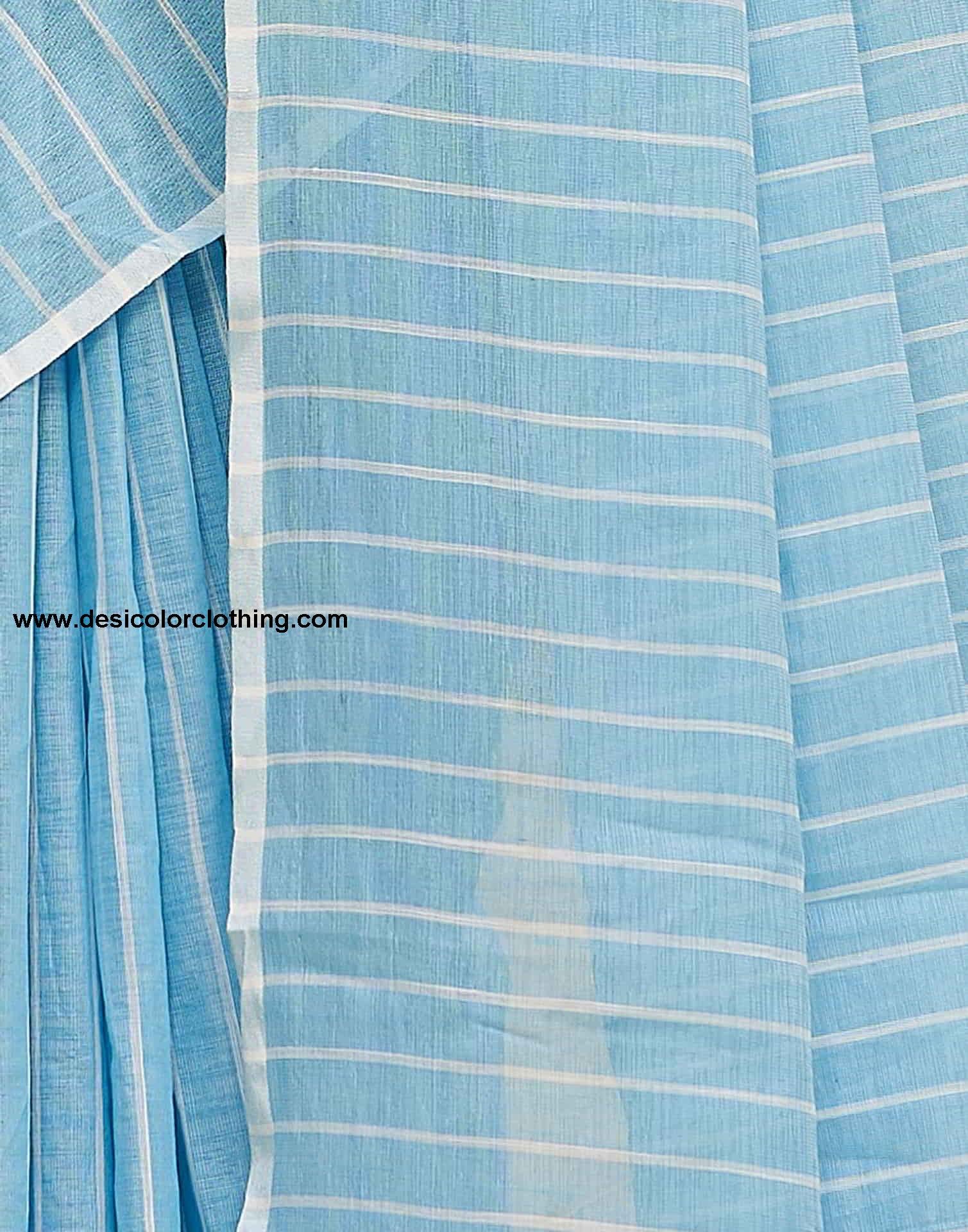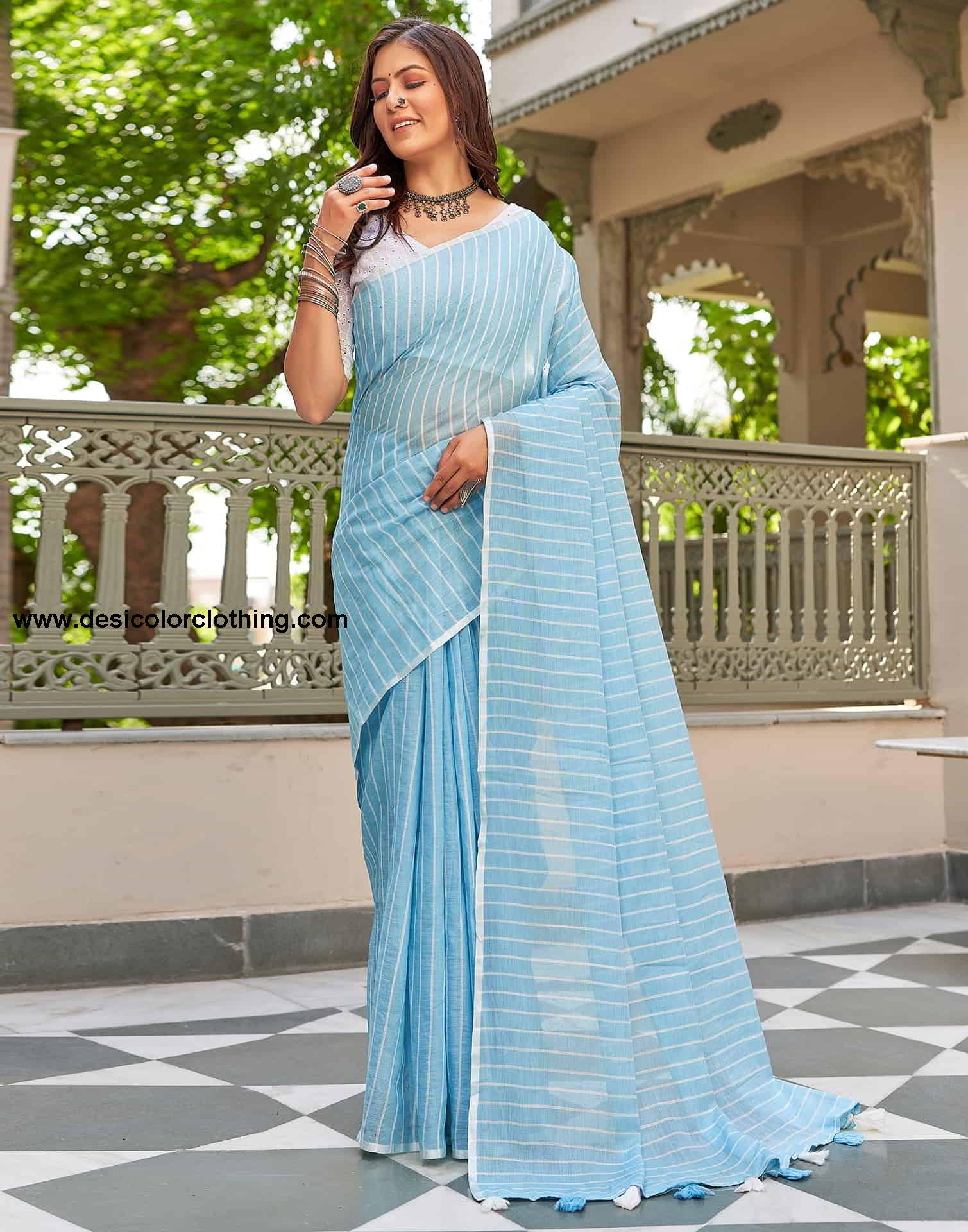 Blouse Color:White Blouse Fabric:Cotton Blouse Length:0.80 Mtr Blouse Work:Solid, Shifali Embroidery Saree Color:Blue, White Saree Fabric:Linen Saree Length:5.40 Mtr Saree Work:Woven, Tassels Type:Leheriya
