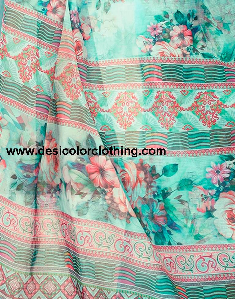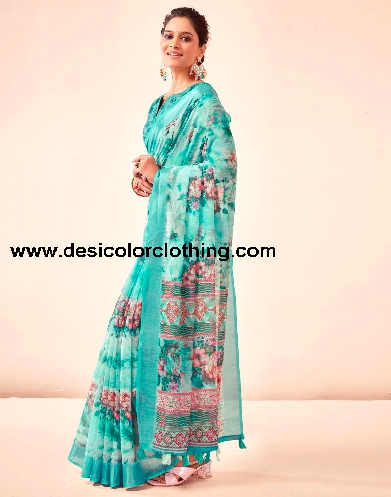 Blouse Color:Sky Blue Blouse Fabric:Poly Linen Blouse Length:0.80 Mtr Blouse Work:Digital Printed Saree Color:Blue, Turquoise, Multi Saree Fabric:Poly Linen Saree Length:5.50 Mtr Saree Work:Digital Printed