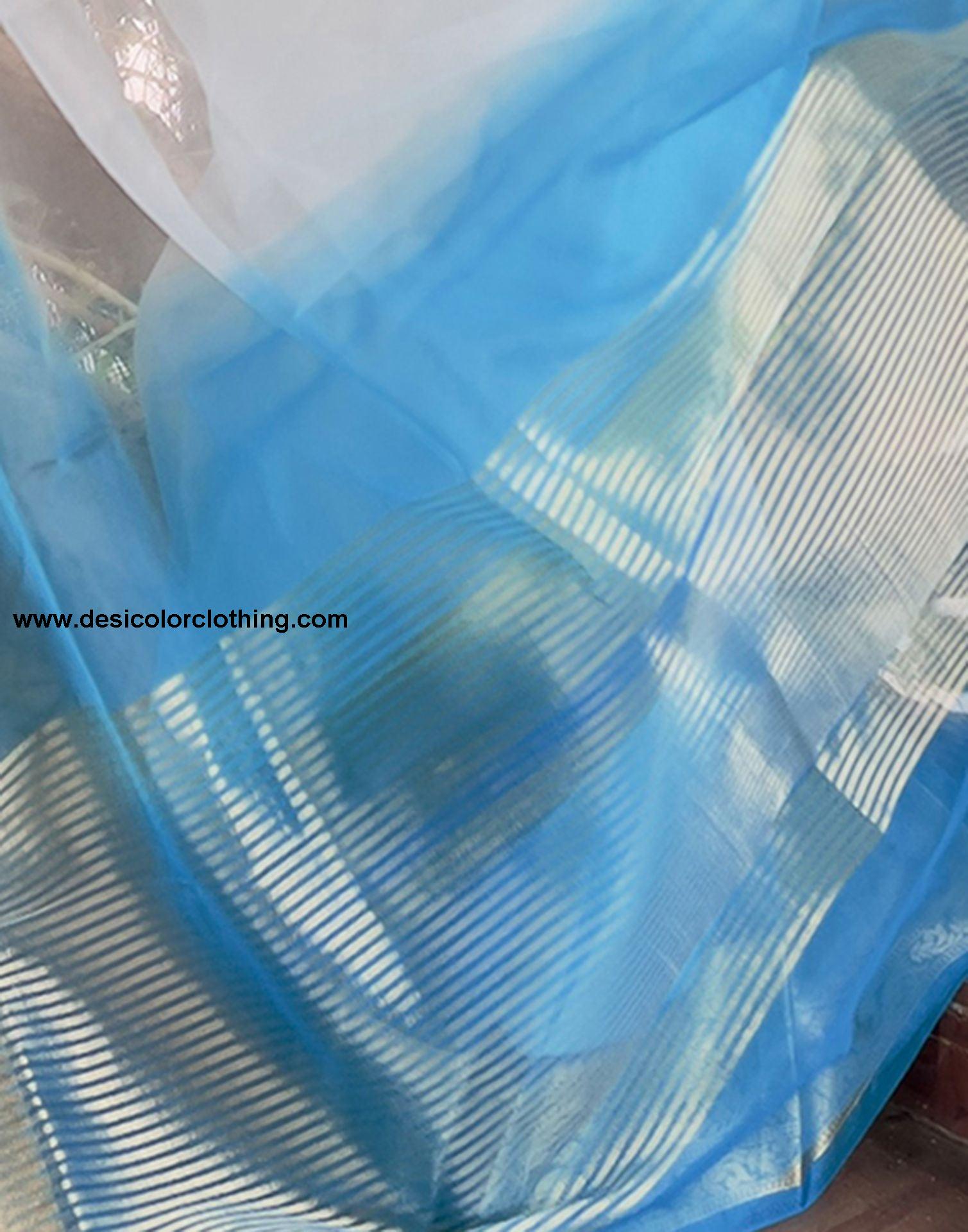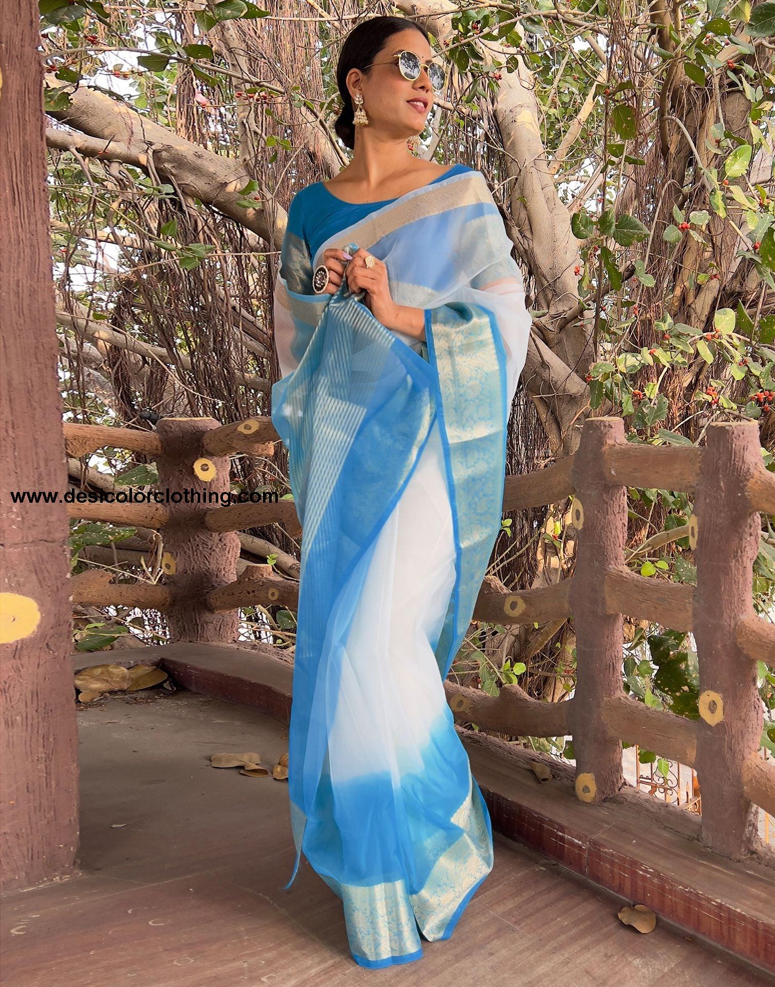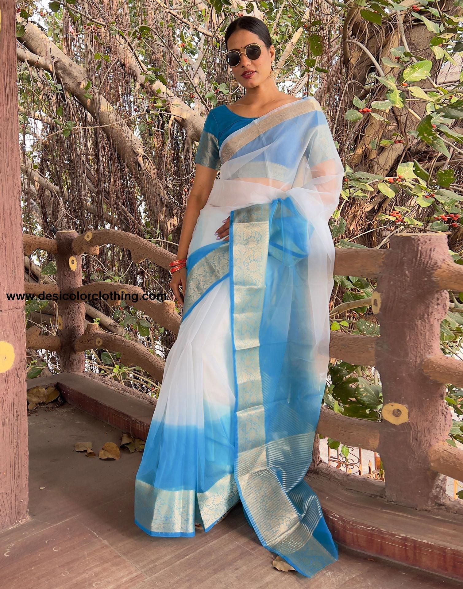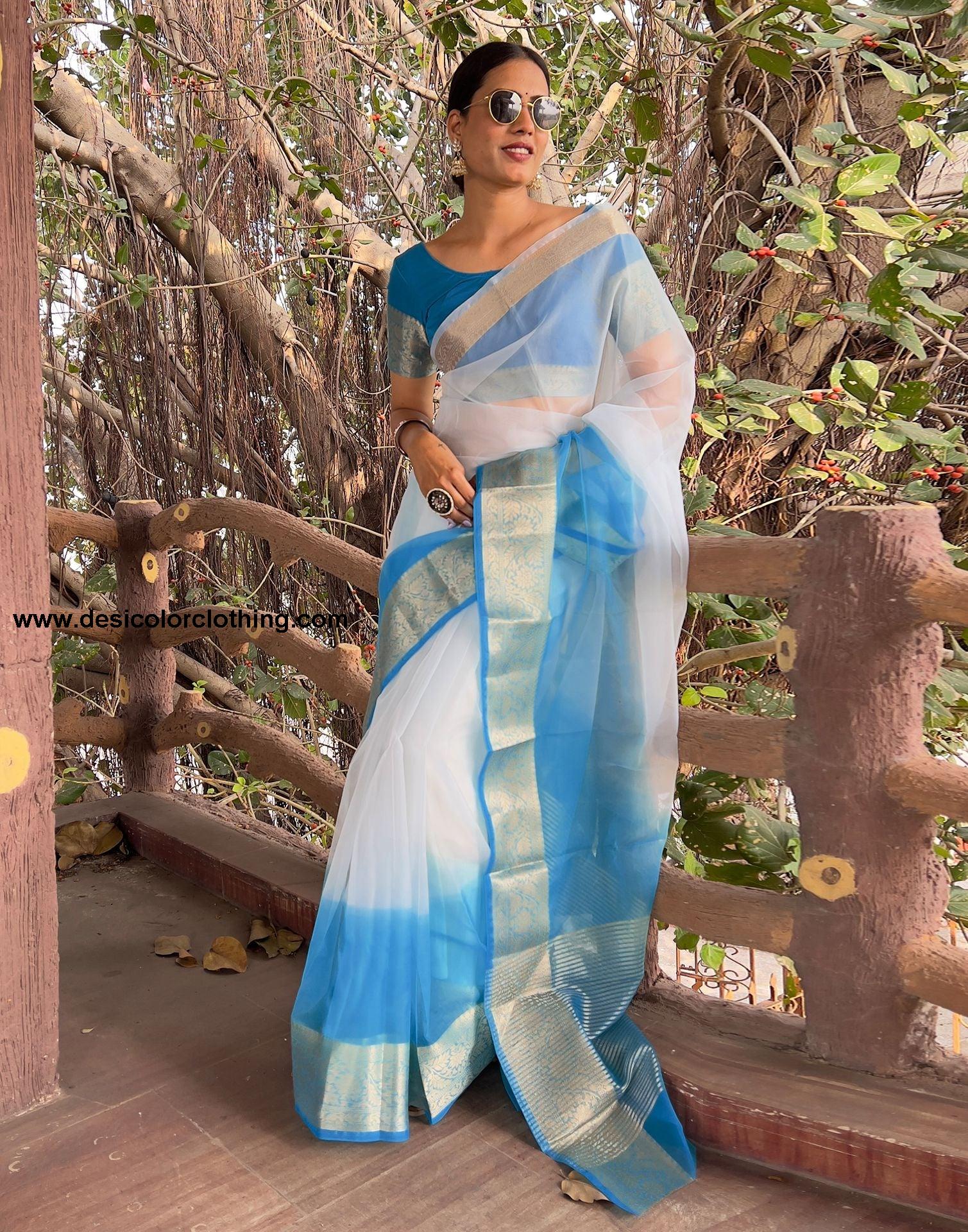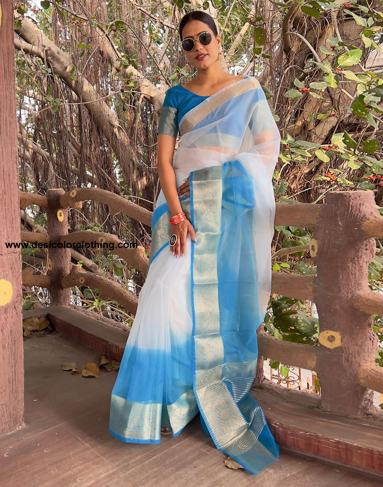 Blouse Color:Blue Blouse Fabric:Organza Blouse Length:0.80 Mtr Blouse Work:Plain, Jacquard Border Saree Color:Blue, White Saree Fabric:Organza Saree Length:5.50 Mtr Saree Work:Dyed, Jacquard Border