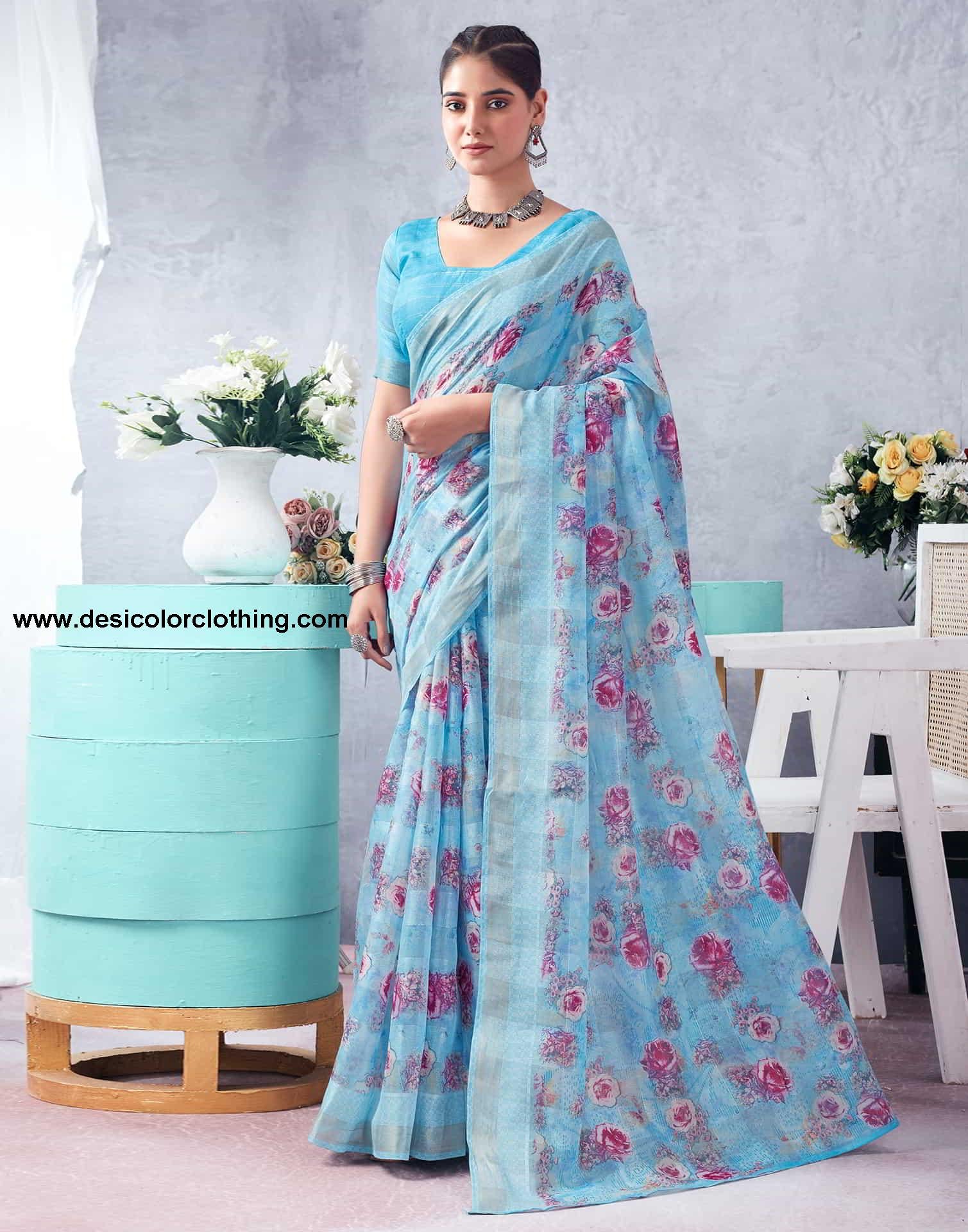 Blouse Color:Blue, White Blouse Fabric:Cotton Blend Blouse Length:0.70 Mtr Blouse Work:Geometric Printed, Zari Stripe Saree Color:Blue, Magenta, Multi Saree Fabric:Cotton Blend Saree Length:5.30 Mtr Saree Work:Floral Printed, Zari Stripe Type:Printed