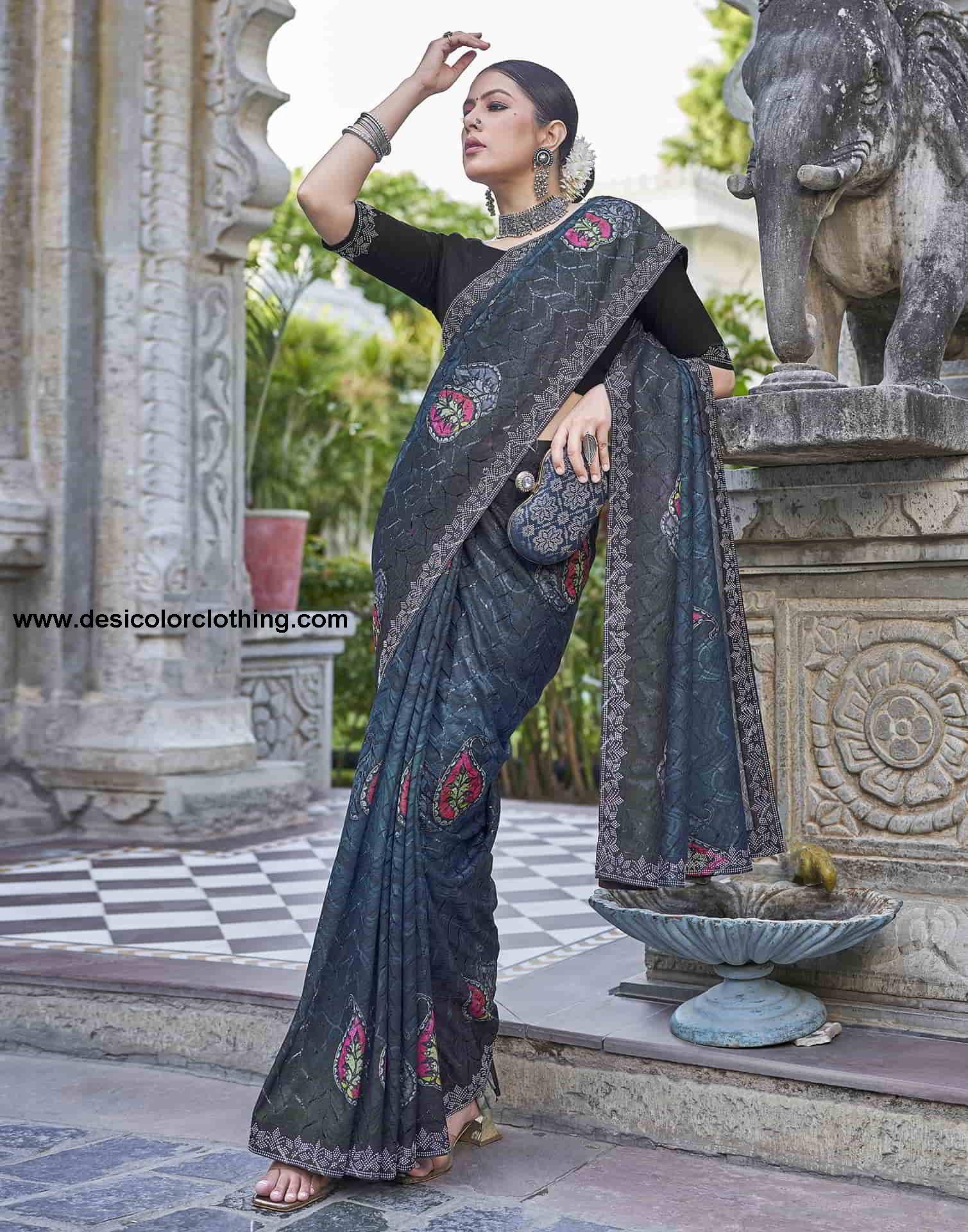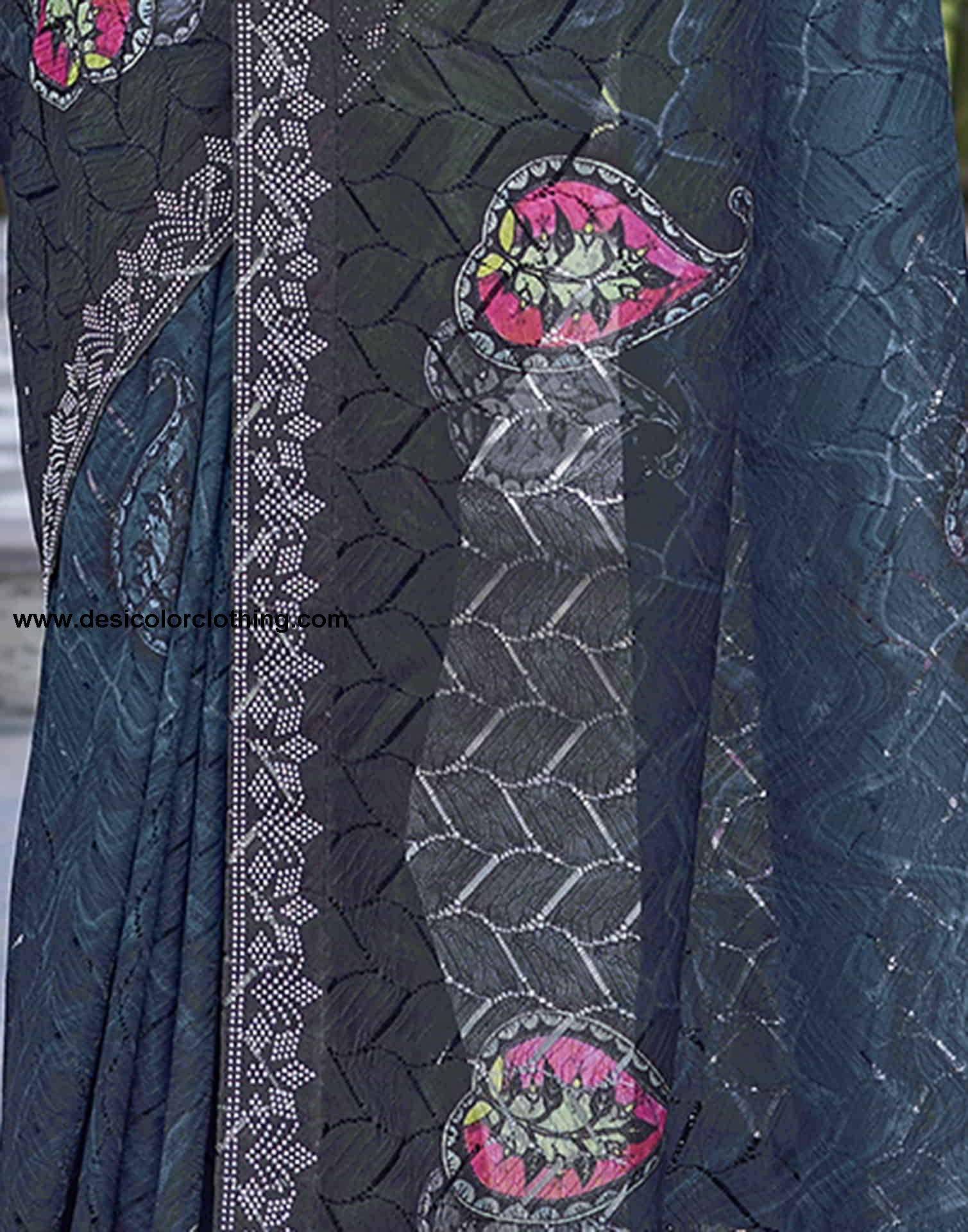 Blouse Color:Black Blouse Fabric:Bhagalpuri Silk Blouse Length:0.80 Mtr Blouse Work:Plain, Stone Work Saree Color:Rama Blue, Black, Multi Saree Fabric:Russel Net Saree Length:5.30 Mtr Saree Work:Knitted, Printed, Stone Work Border Type:Printed