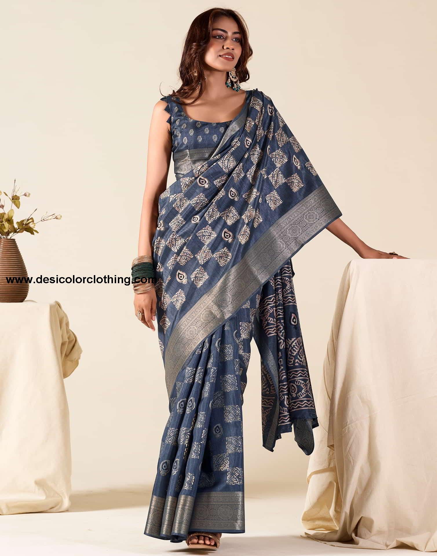 Blouse Color:Dusty Dark Blue, Beige, Golden Blouse Fabric:Silk Blouse Length:0.80 Mtr Blouse Work:Block Printed, Foil Print, Woven Border Saree Color:Dusty Dark Blue, Beige, Golden Saree Fabric:Silk Saree Length:5.50 Mtr Saree Work:Block Printed, Foil Print, Woven Border