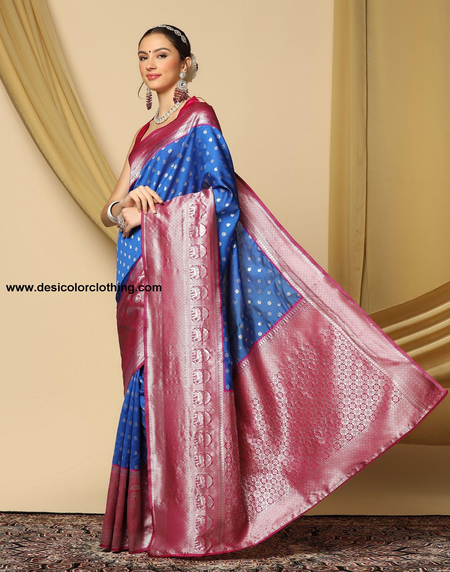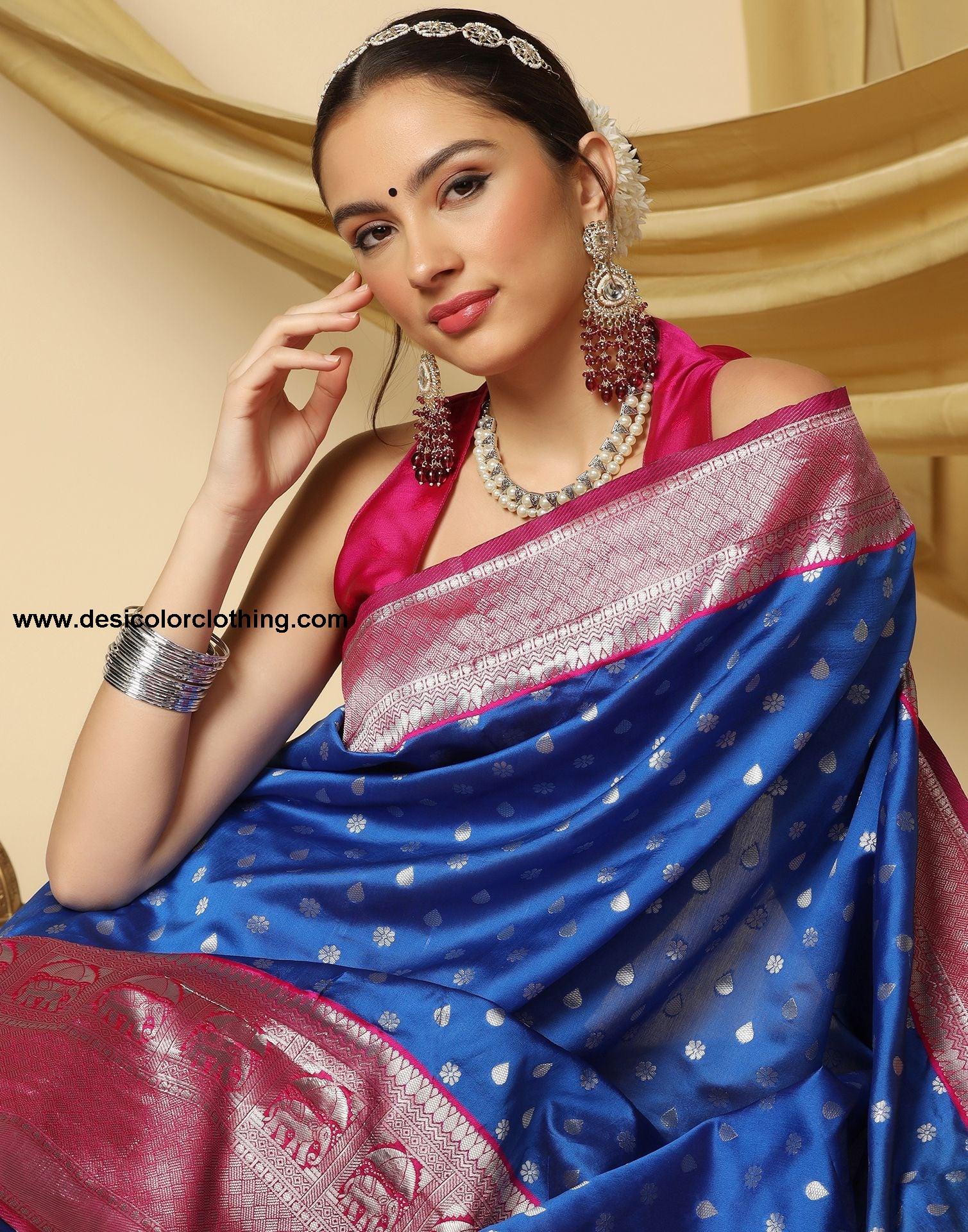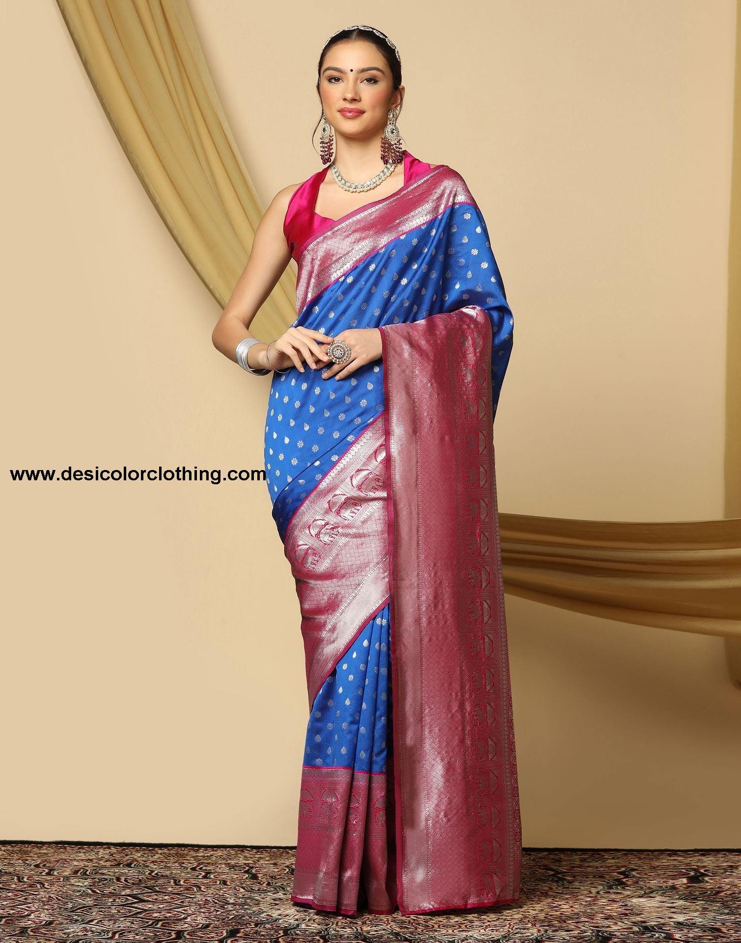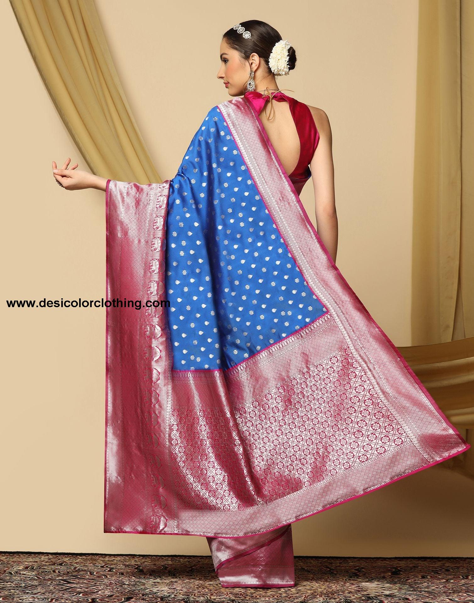 Blouse Color:Pink Blouse Fabric:Poly Silk Blouse Length:0.80 Mtr Blouse Work:Jacquard Border, Self Woven Saree Color:Blue Saree Fabric:Poly Silk Saree Length:5.30 Mtr Saree Work:Jacquard Type:Banarasi