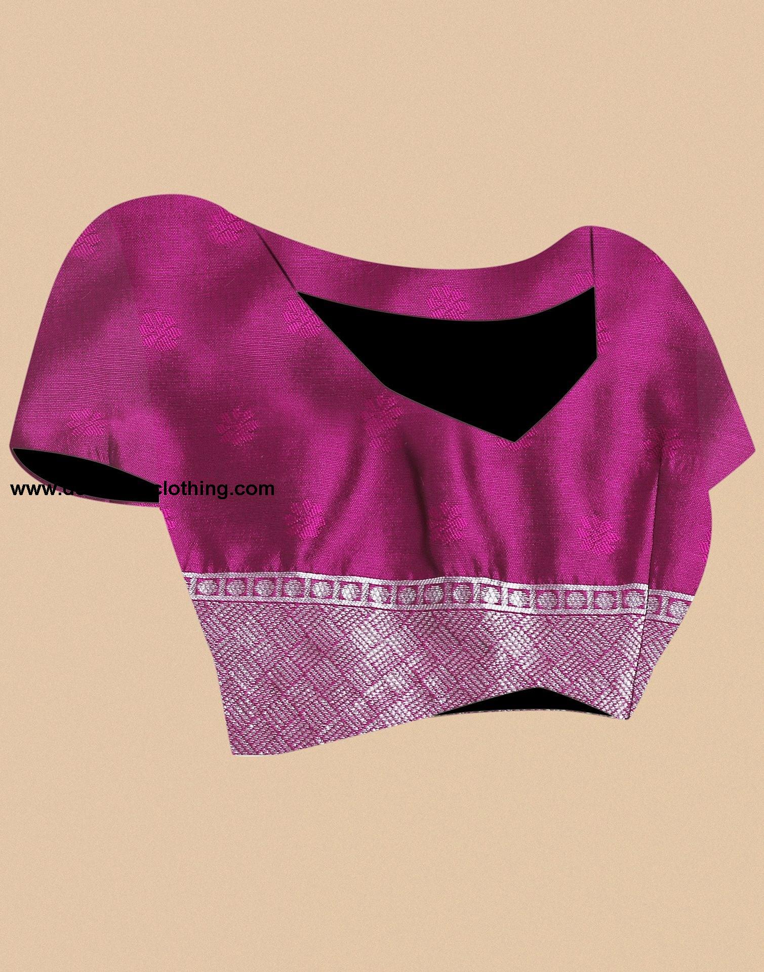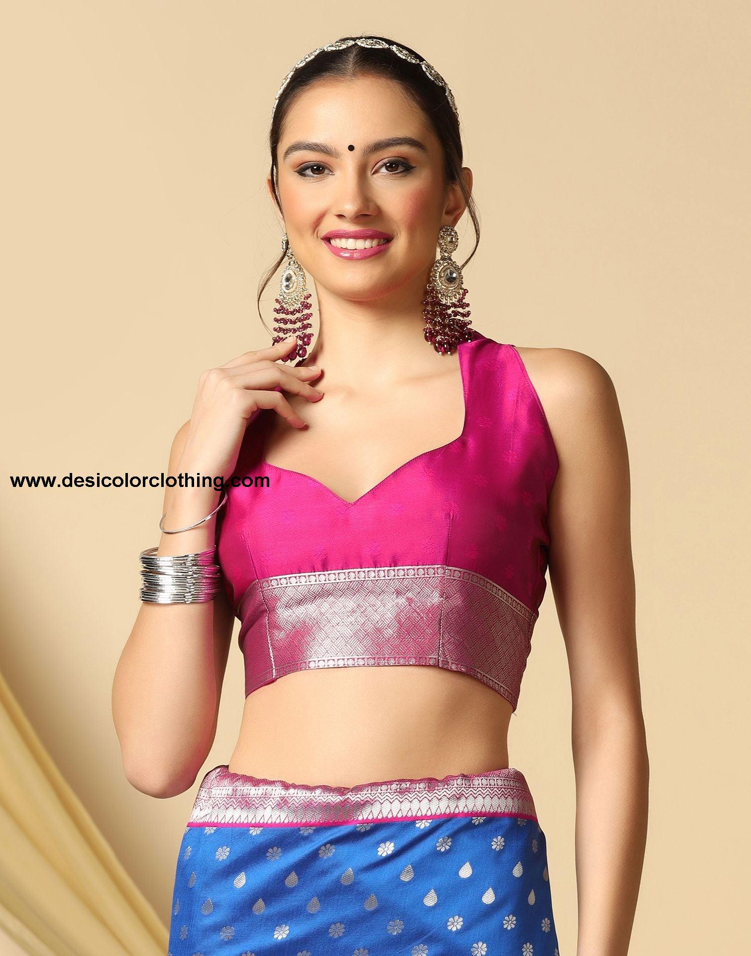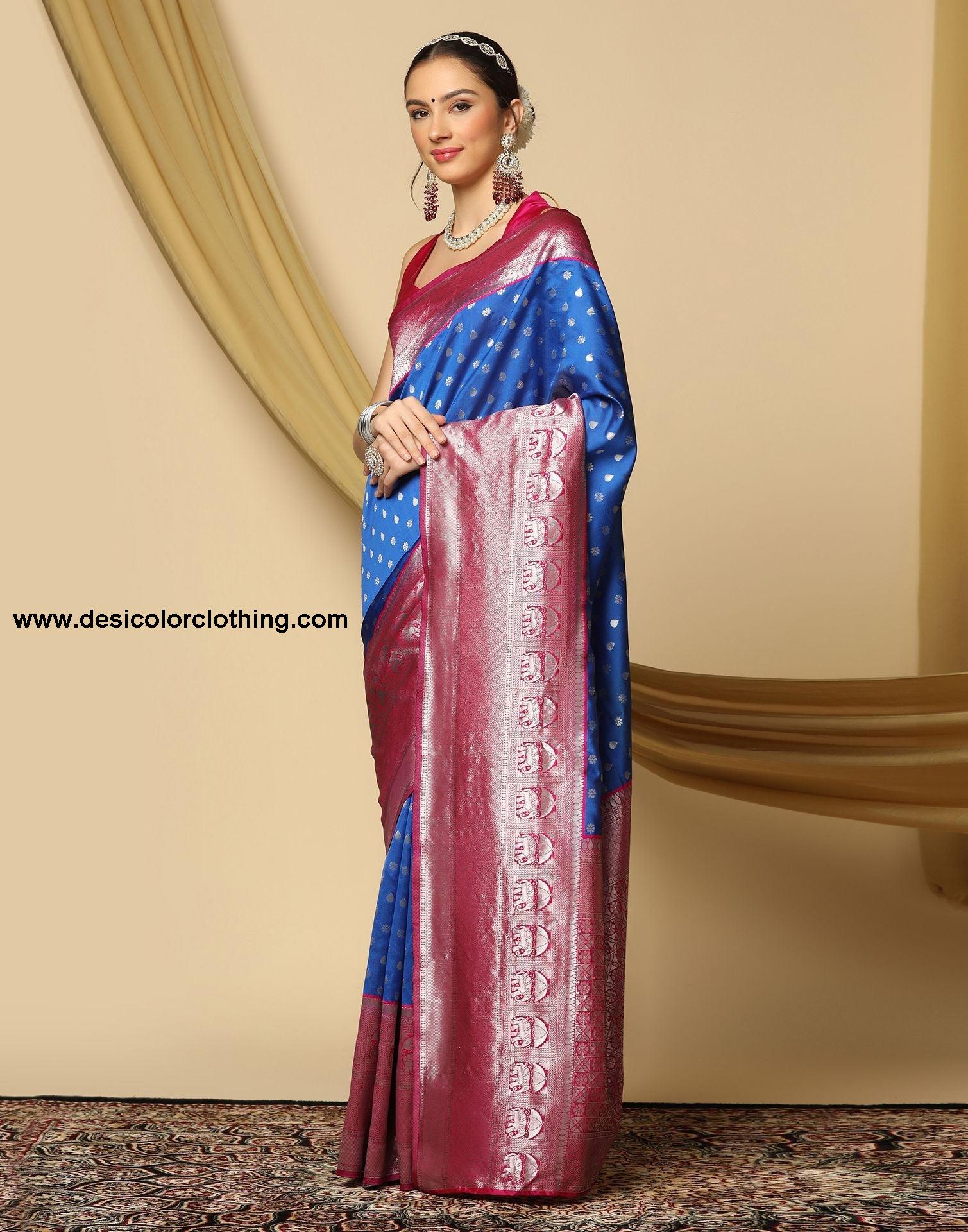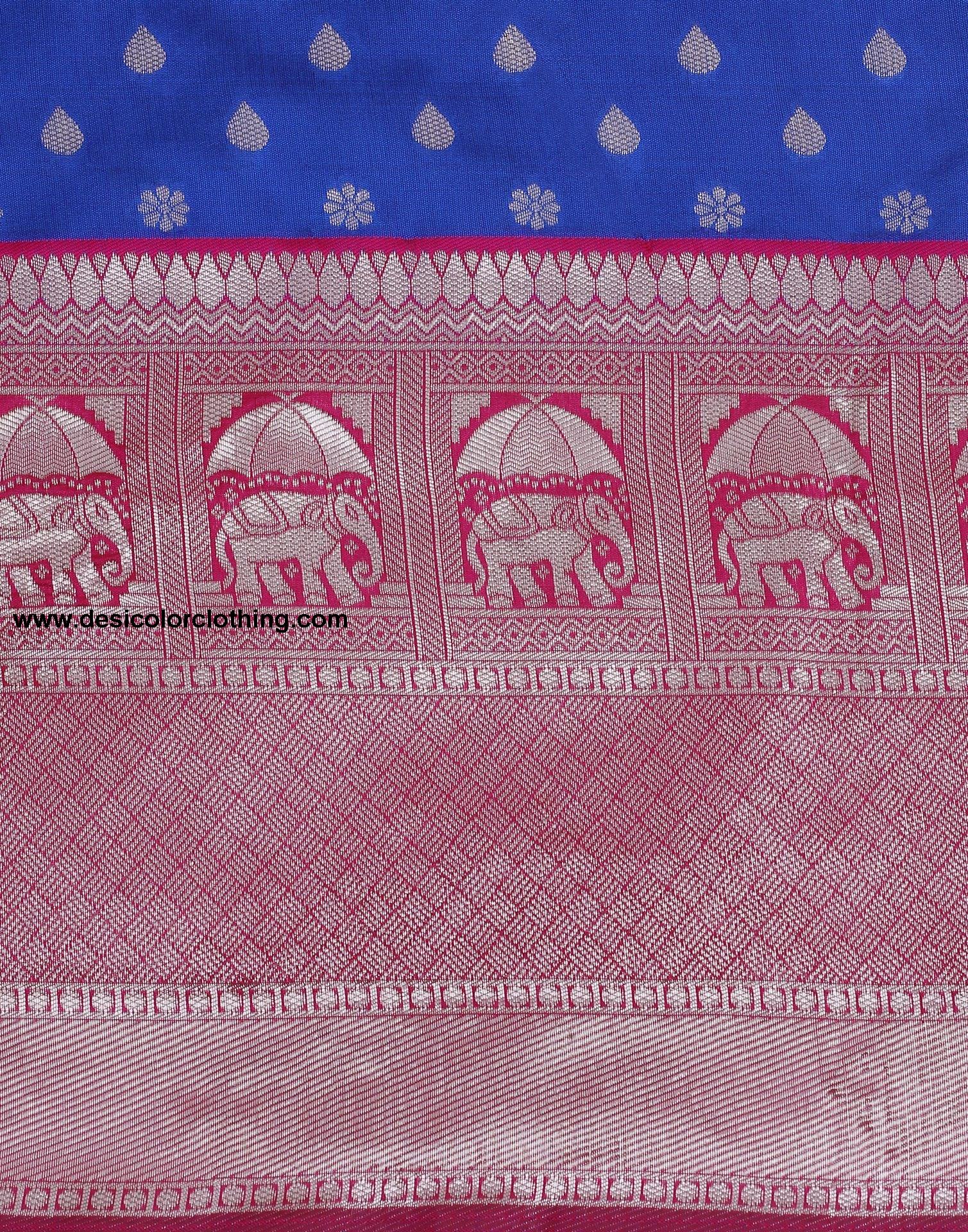 Blouse Color:Pink Blouse Fabric:Poly Silk Blouse Length:0.80 Mtr Blouse Work:Jacquard Border, Self Woven Saree Color:Blue Saree Fabric:Poly Silk Saree Length:5.30 Mtr Saree Work:Jacquard Type:Banarasi