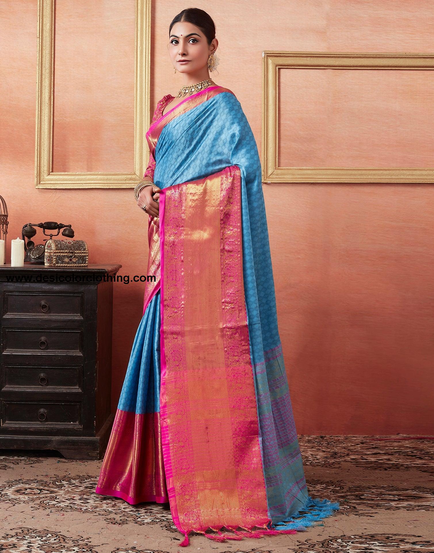 Blouse Color:Rani Pink, Golden Blouse Fabric:Plain Blouse Length:0.80 Mtr Blouse Work:Plain, Weaving Saree Color:Blue, Rani Pink Saree Fabric:Cotton Silk Saree Length:5.50 Mtr Saree Work:Weaving