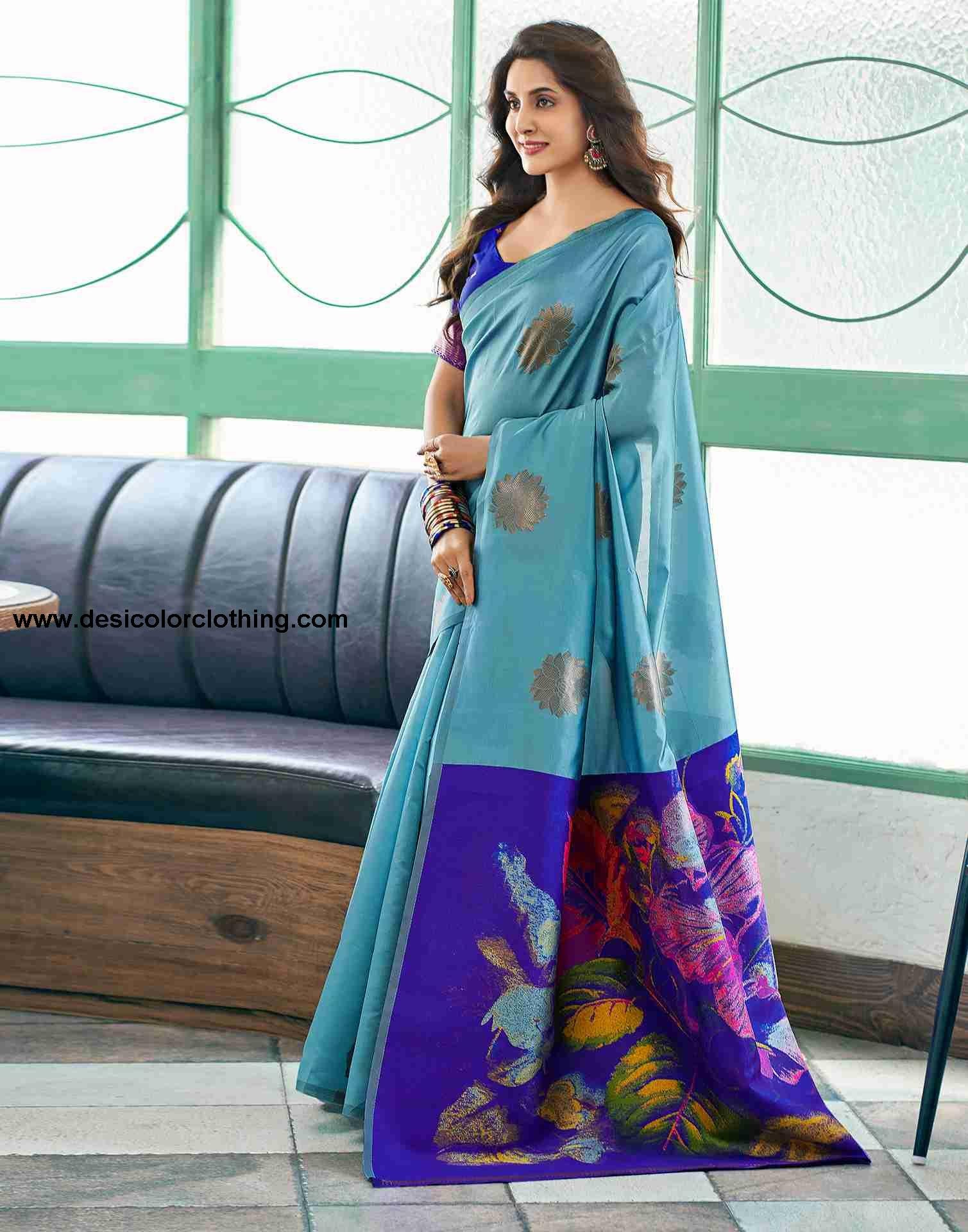 Blouse Color:Dark Blue, Copper Blouse Fabric:Silk Blouse Length:0.80 Mtr Blouse Work:Plain, Woven Saree Color:Dark Blue, Sky Blue, Multi Saree Fabric:Silk Saree Length:5.50 Mtr Saree Work:Plain, Woven