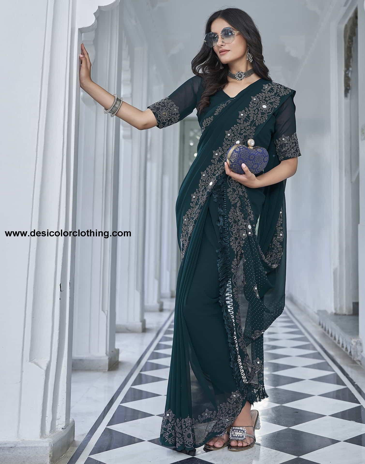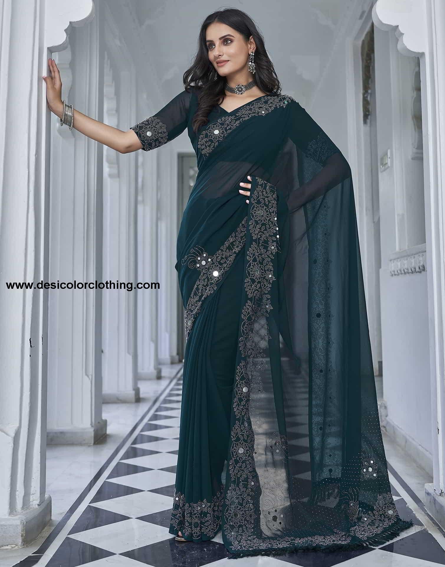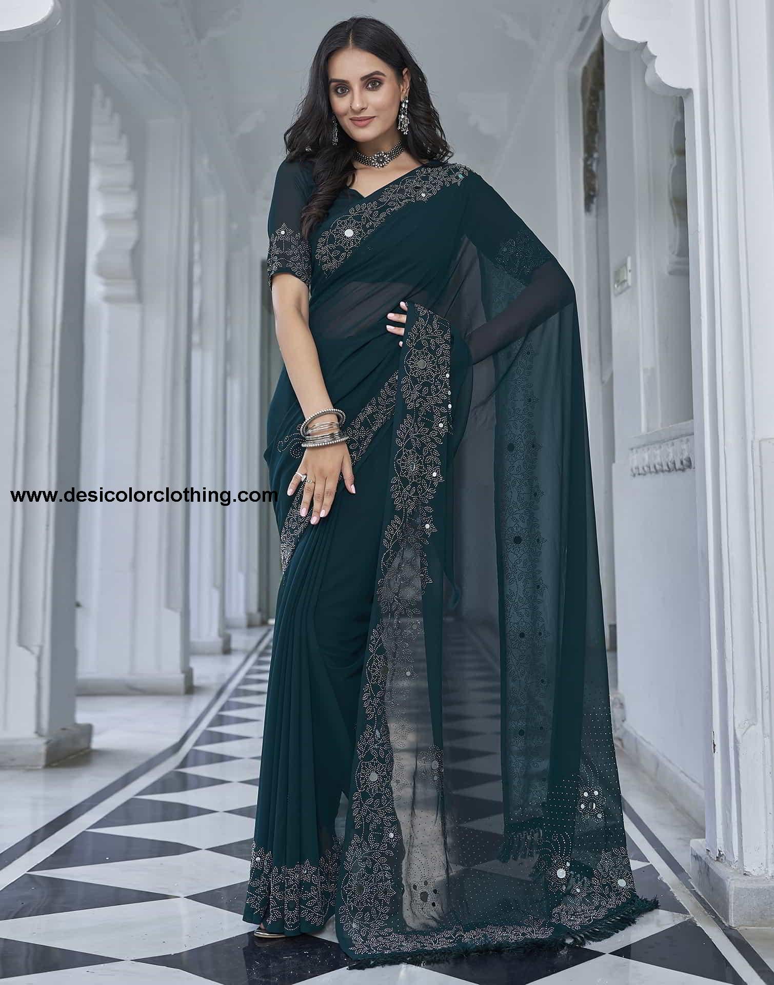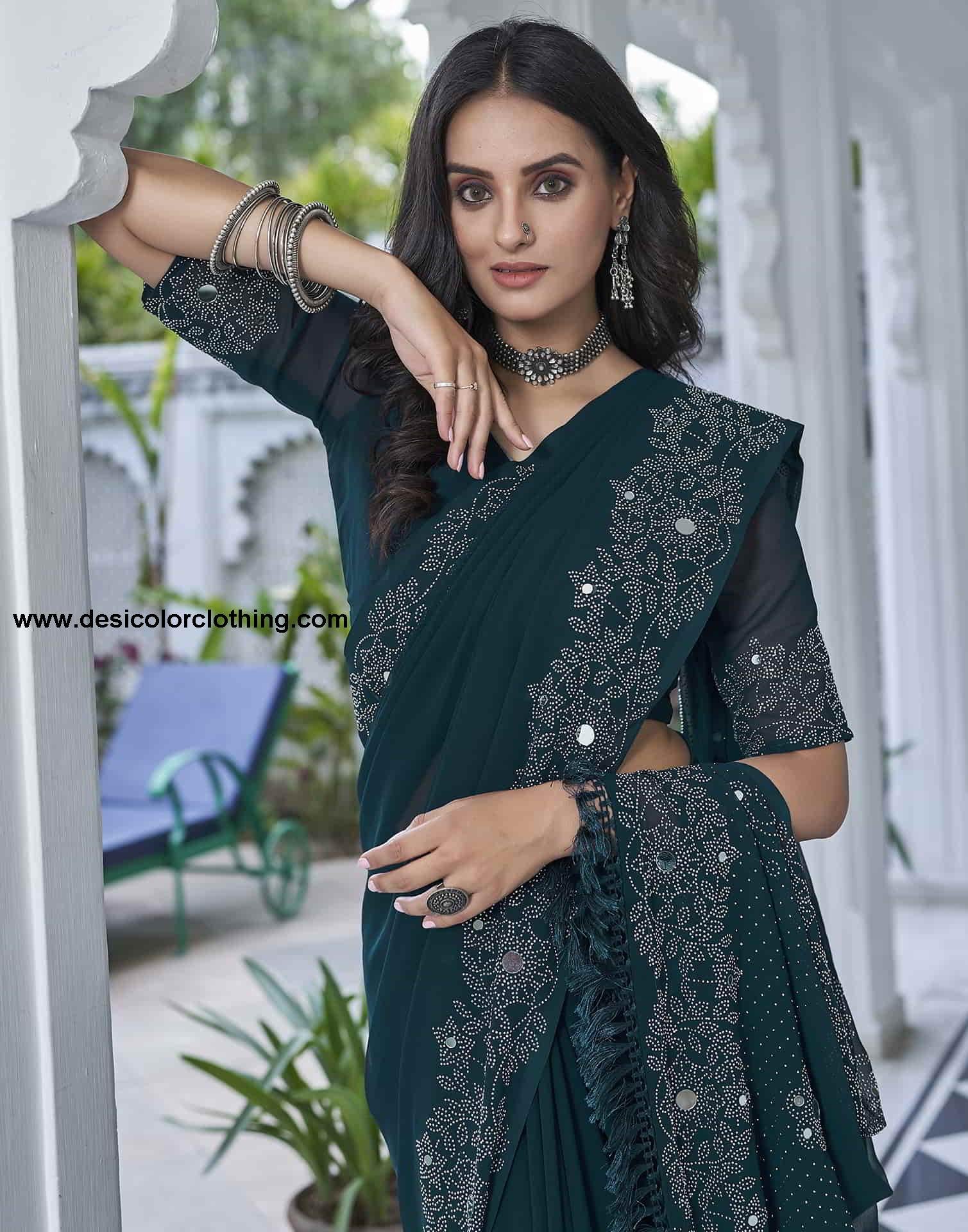 Blouse Color:Rama Blue Blouse Fabric:Georgette Blouse Length:0.80 Mtr Blouse Work:Plain, Stone Work Saree Color:Rama Blue, Silver Saree Fabric:Georgette Saree Length:5.50 Mtr Saree Work:Plain, Stone Work, Mirror Work, Tassels Type:Embellished