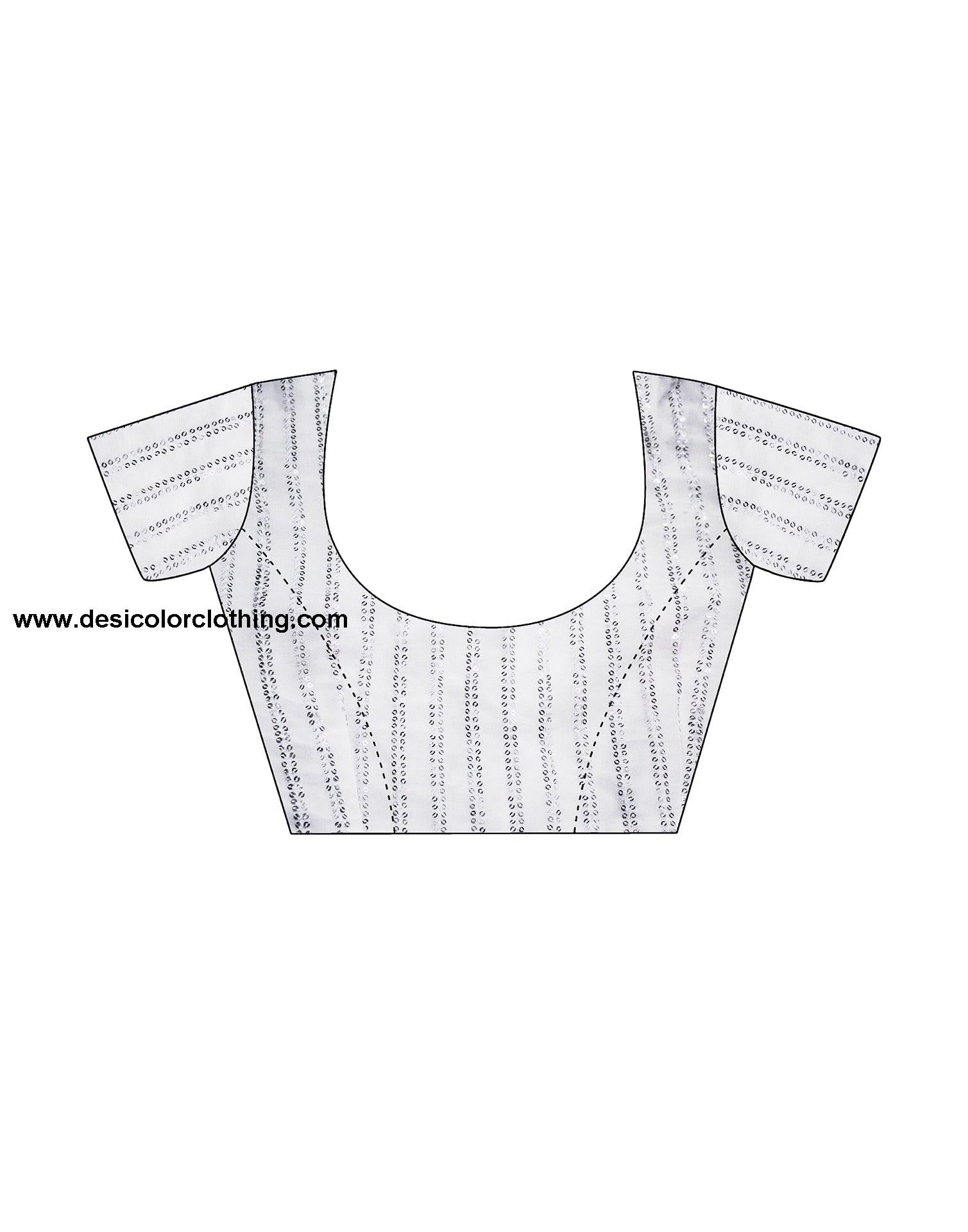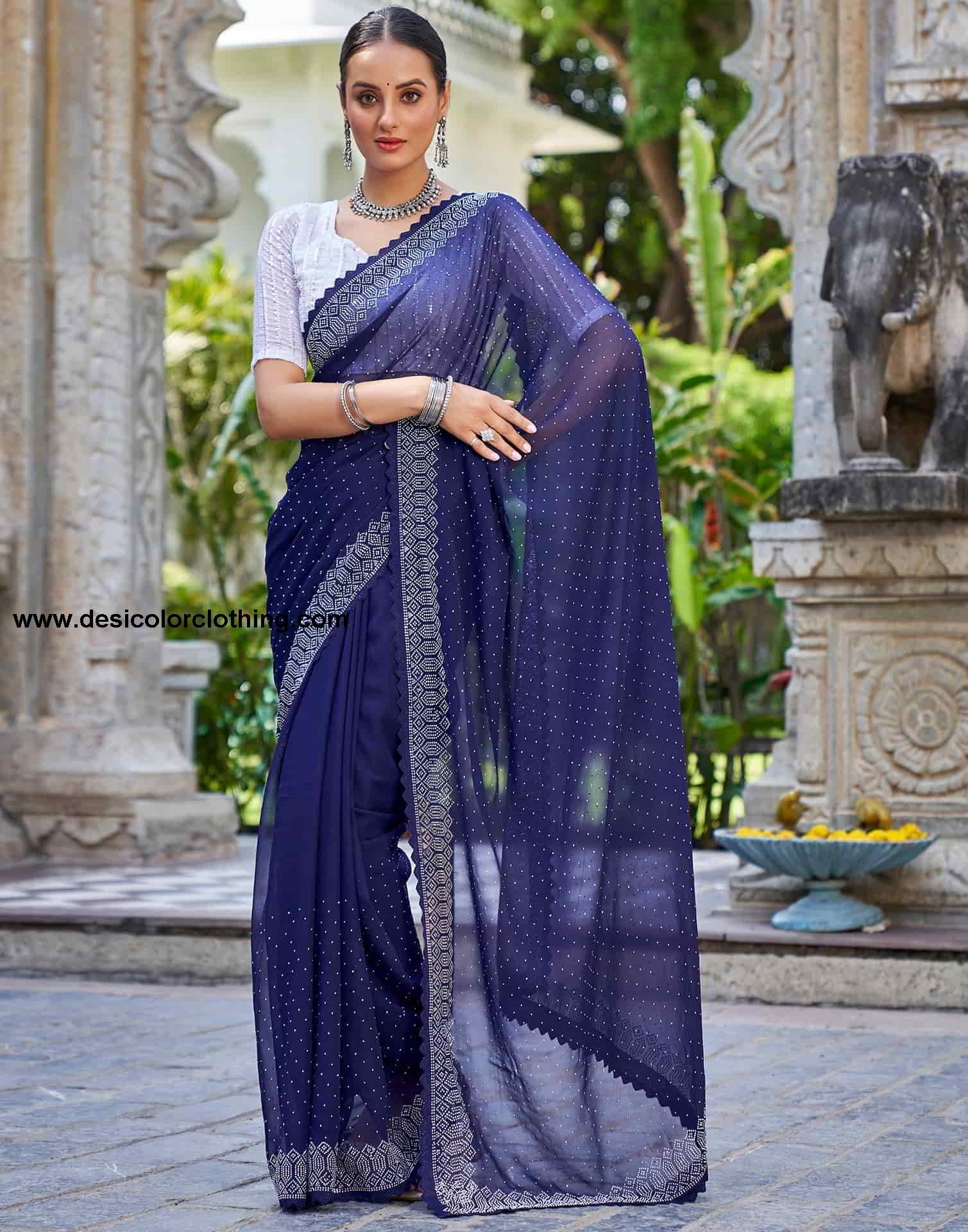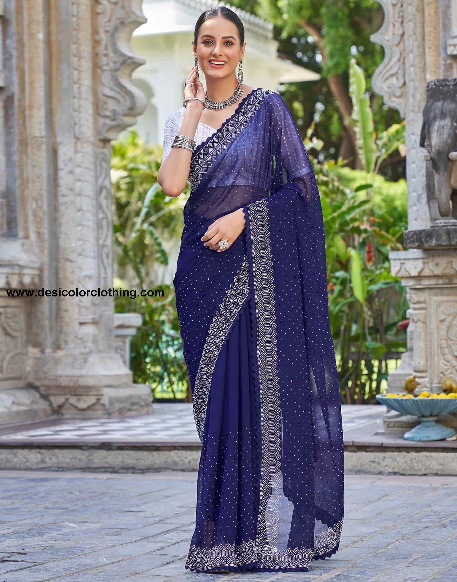 Blouse Color:White Blouse Fabric:Georgette Blouse Length:0.80 Mtr Blouse Work:Sequence Embroidery Saree Color:Dark Blue, Silver Saree Fabric:Georgette Saree Length:5.30 Mtr Saree Work:Plain, Stone Work Type:Embellished