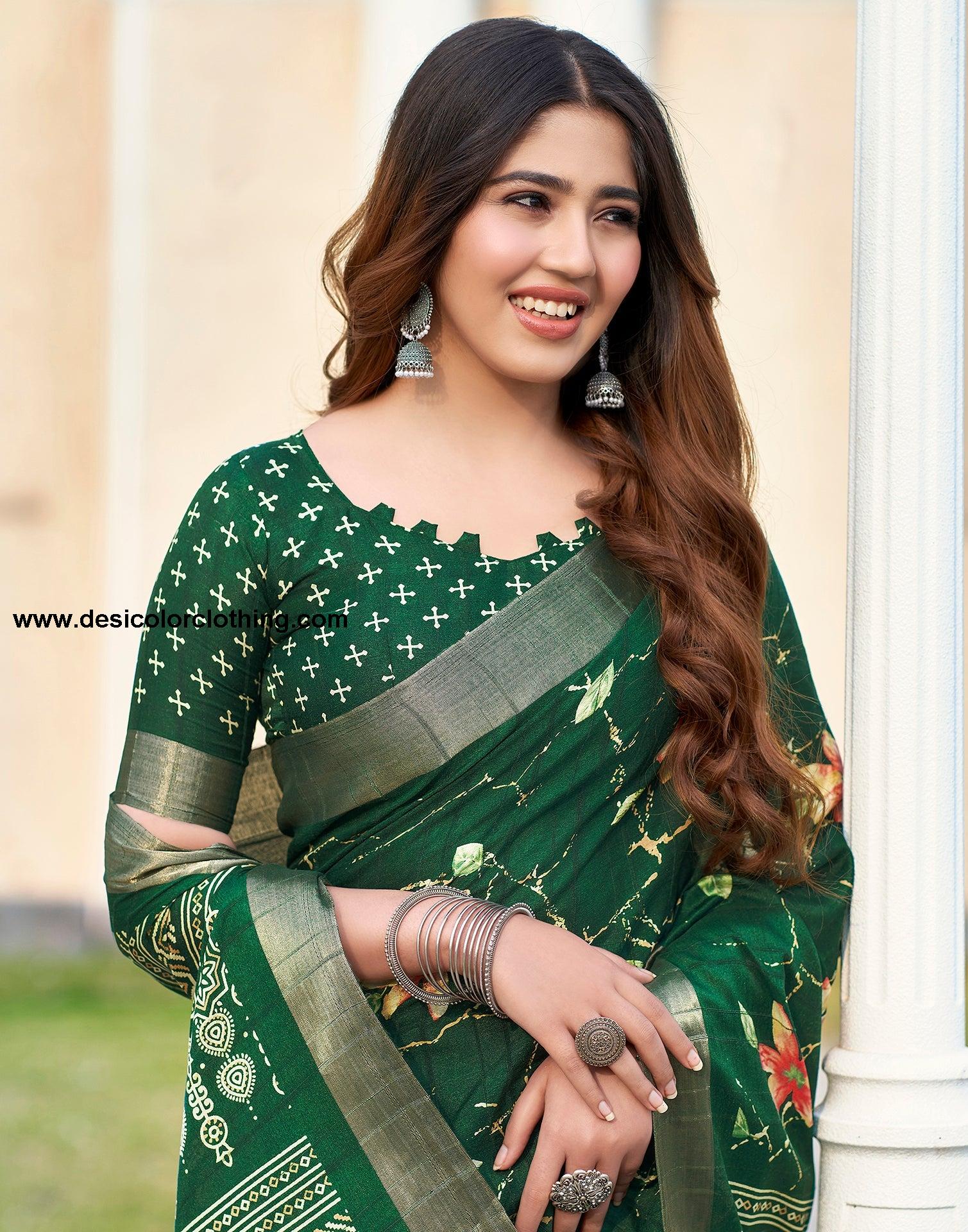 Blouse Color:Bottle Green, Off White Blouse Fabric:Printed Blouse Length:0.80 Mtr Blouse Work:Printed, Zari Border Saree Color:Bottle Green Saree Fabric:Silk Saree Length:5.50 Mtr Saree Work:Printed