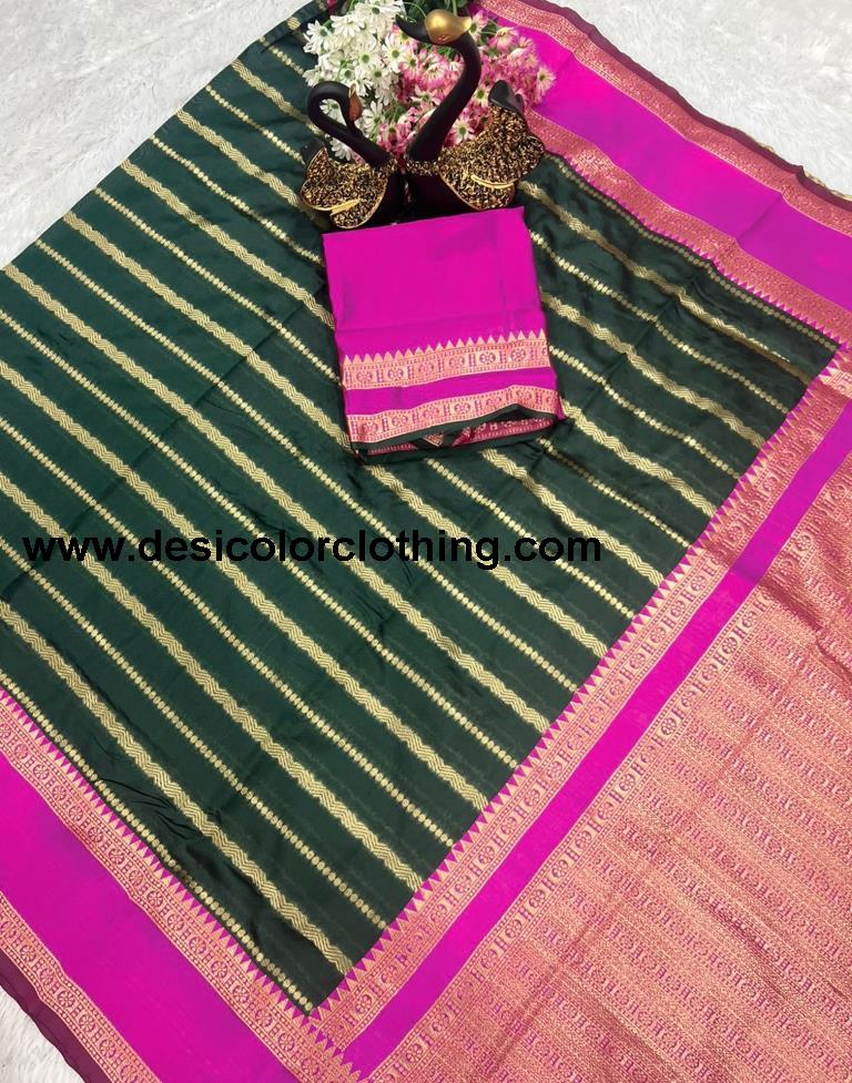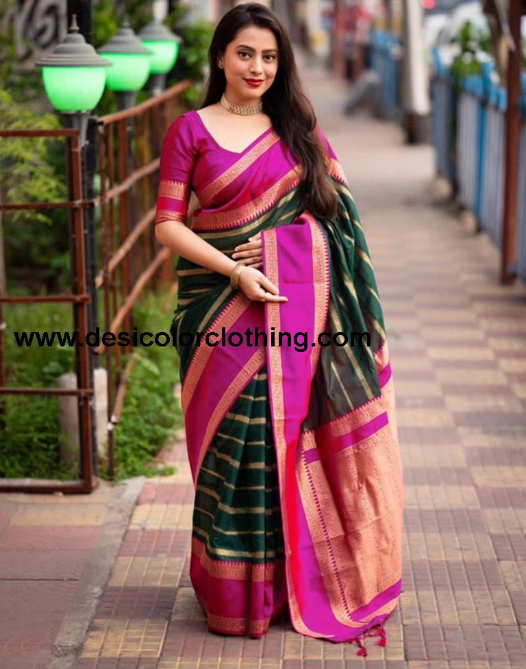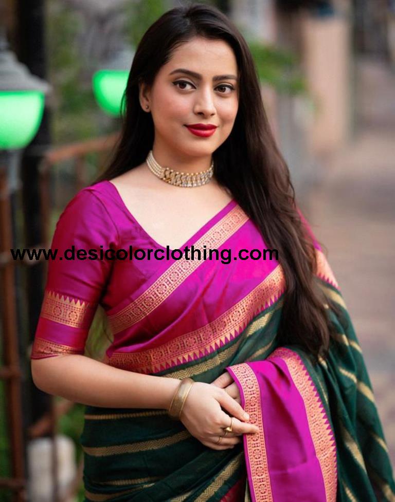 Blouse Color:Pink Blouse Fabric:Poly Silk Blouse Length:0.80 Mtr Blouse Work:Plain, Jacquard Saree Color:Bottle Green Saree Fabric:Poly Silk Saree Length:5.50 Mtr Saree Work:Weaving