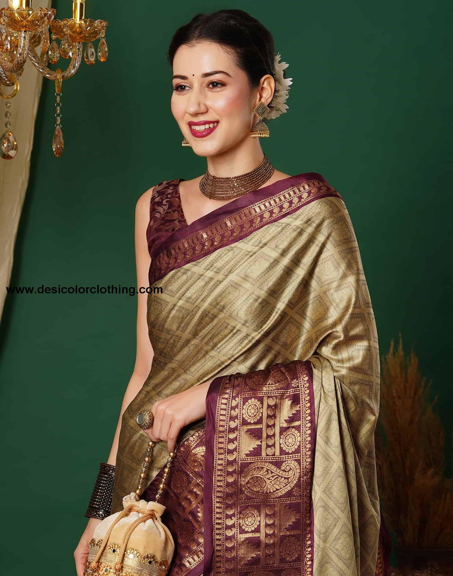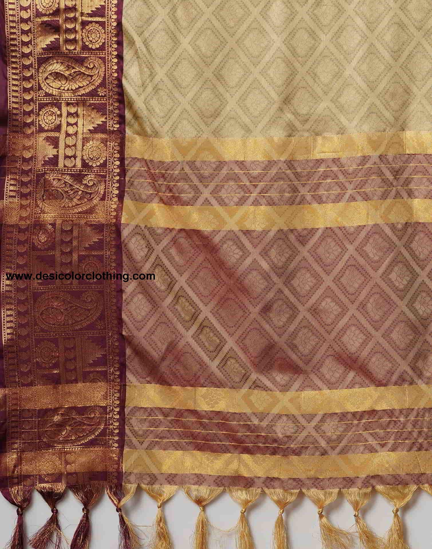 Blouse Color:Wine, Golden Blouse Fabric:Silk Blouse Length:0.80 Mtr Blouse Work:Plain, Woven Saree Color:Khaki, Wine, Golden Saree Fabric:Silk Blend Saree Length:5.50 Mtr Saree Work:Self Woven, Woven, Tassels Type:Banarasi