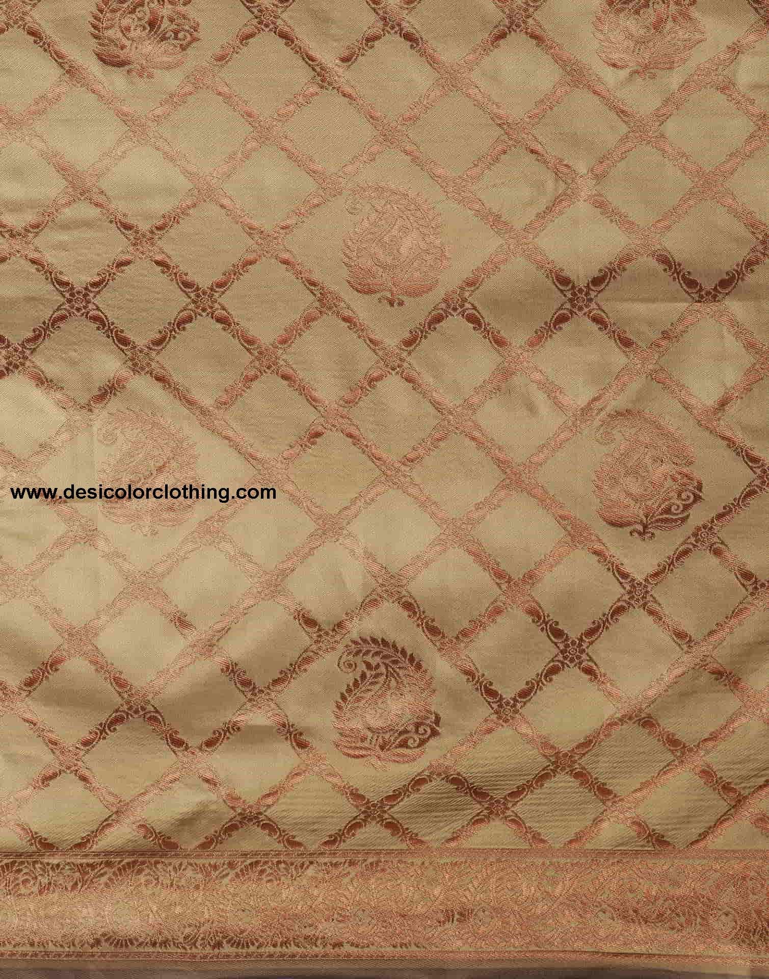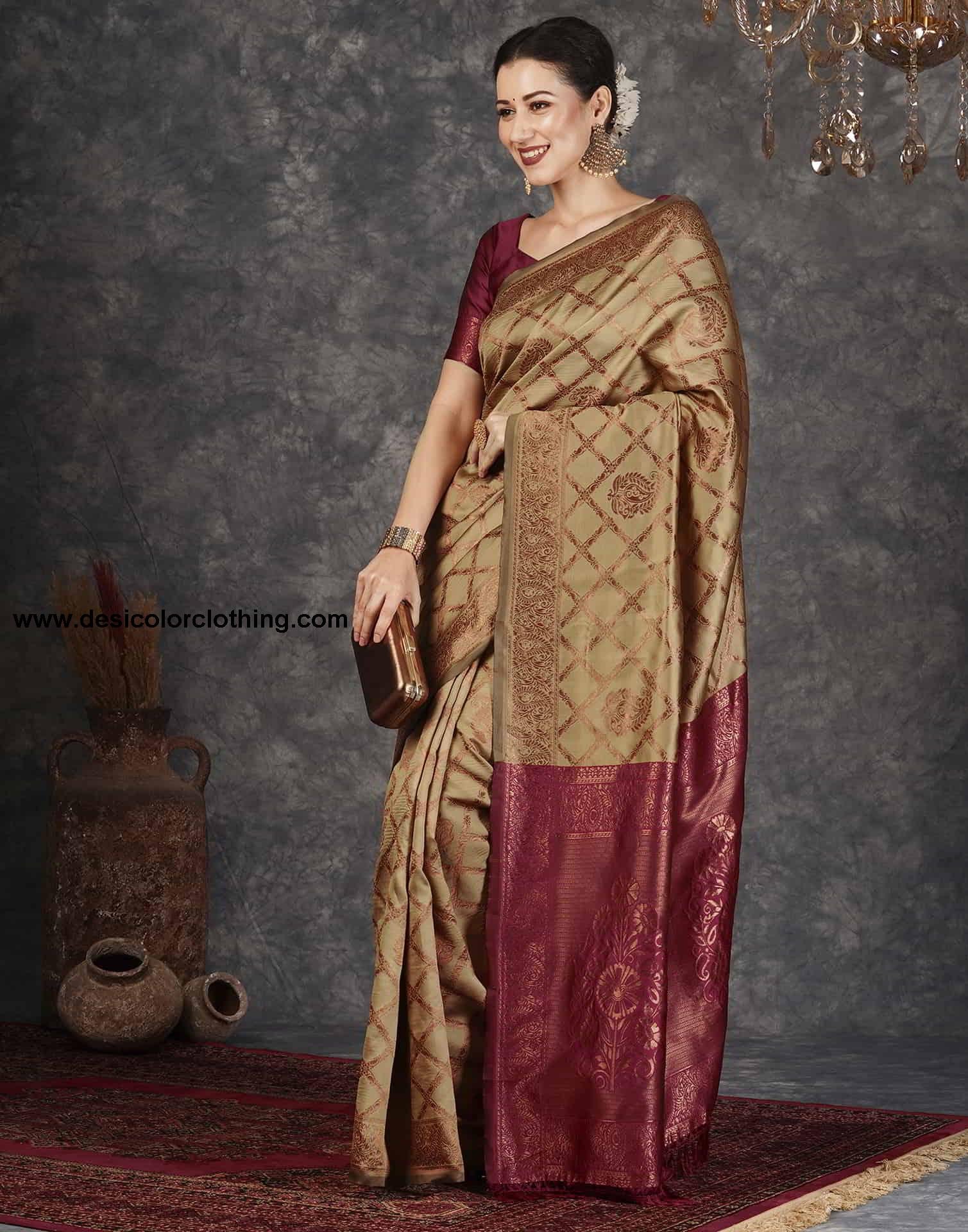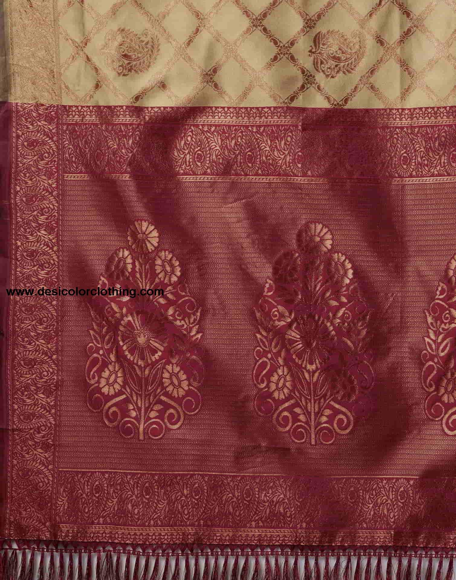 Blouse Color:Maroon Blouse Fabric:Silk Blouse Length:0.80 Mtr Blouse Work:Plain, Woven Saree Color:Khaki, Maroon, Golden Saree Fabric:Silk Saree Length:5.50 Mtr Saree Work:Woven, Tassels Type:Banarasi