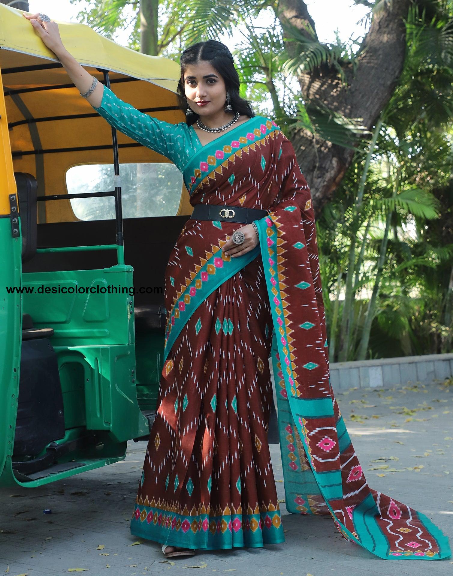 Blouse Color:Teal Blue, White Blouse Fabric:Printed Blouse Length:0.80 Mtr Blouse Work:Printed Saree Color:Brown, Multicoloured Saree Fabric:Cotton Saree Length:5.50 Mtr Saree Work:Printed