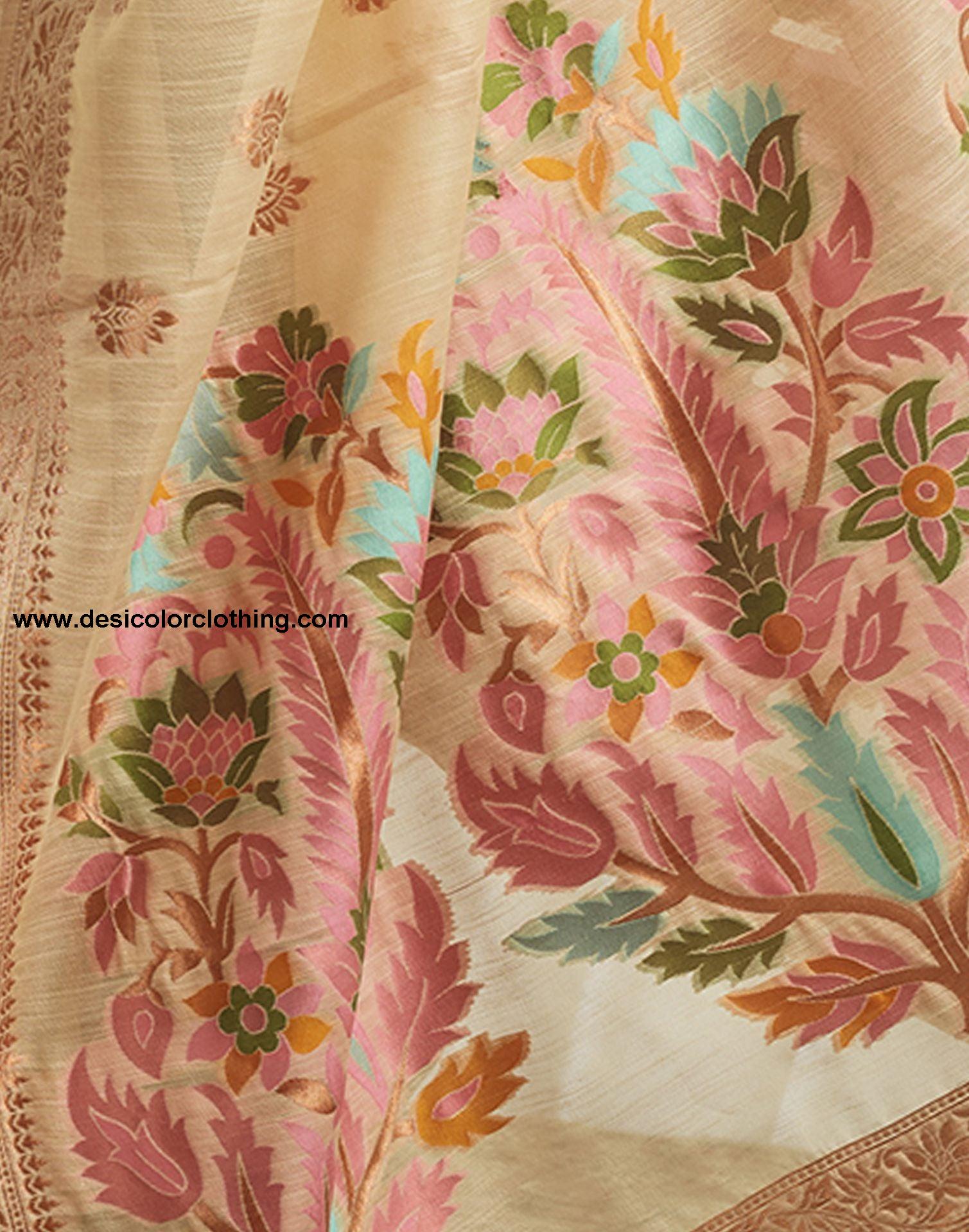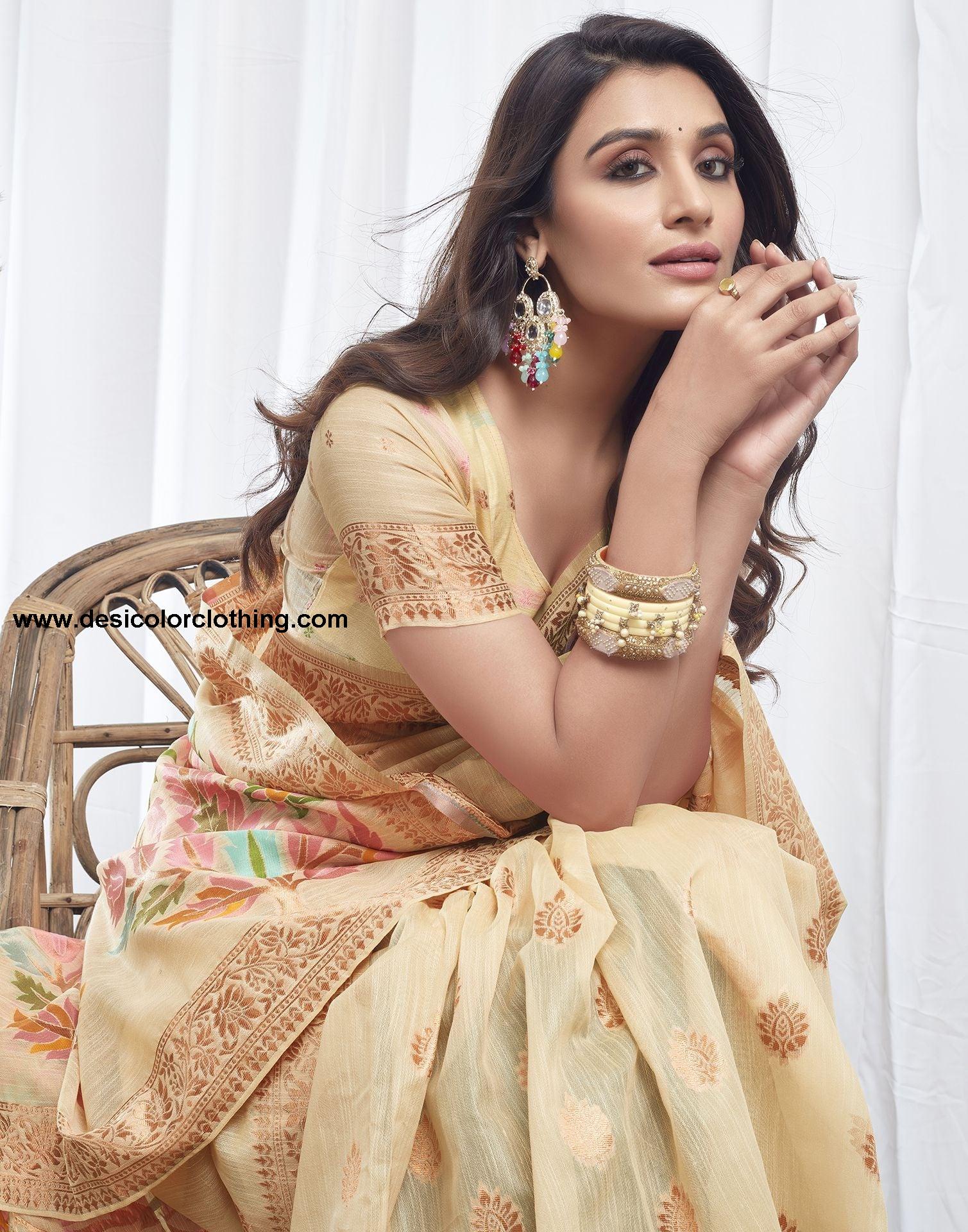 Blouse Color:Cream Blouse Fabric:Poly Linen Blouse Length:0.80 Mtr Blouse Work:Jacquard Saree Color:Cream, Multicoloured Saree Fabric:Poly Linen Saree Length:5.40 Mtr Saree Work:Jacquard