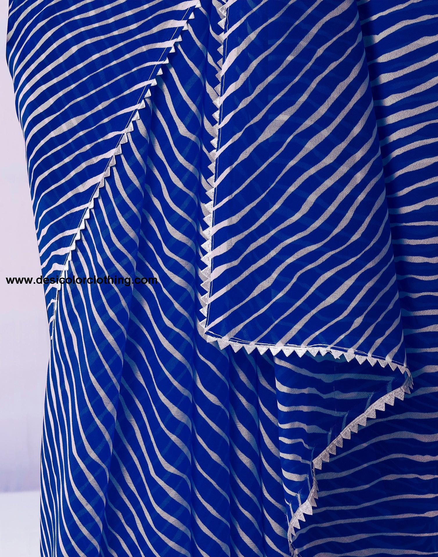 Blouse Color:Silver Blouse Fabric:Woven Blouse Length:0.70 Mtr Blouse Work:Woven Saree Color:Dark Blue, White Saree Fabric:Georgette Saree Length:5.50 Mtr Saree Work:Printed