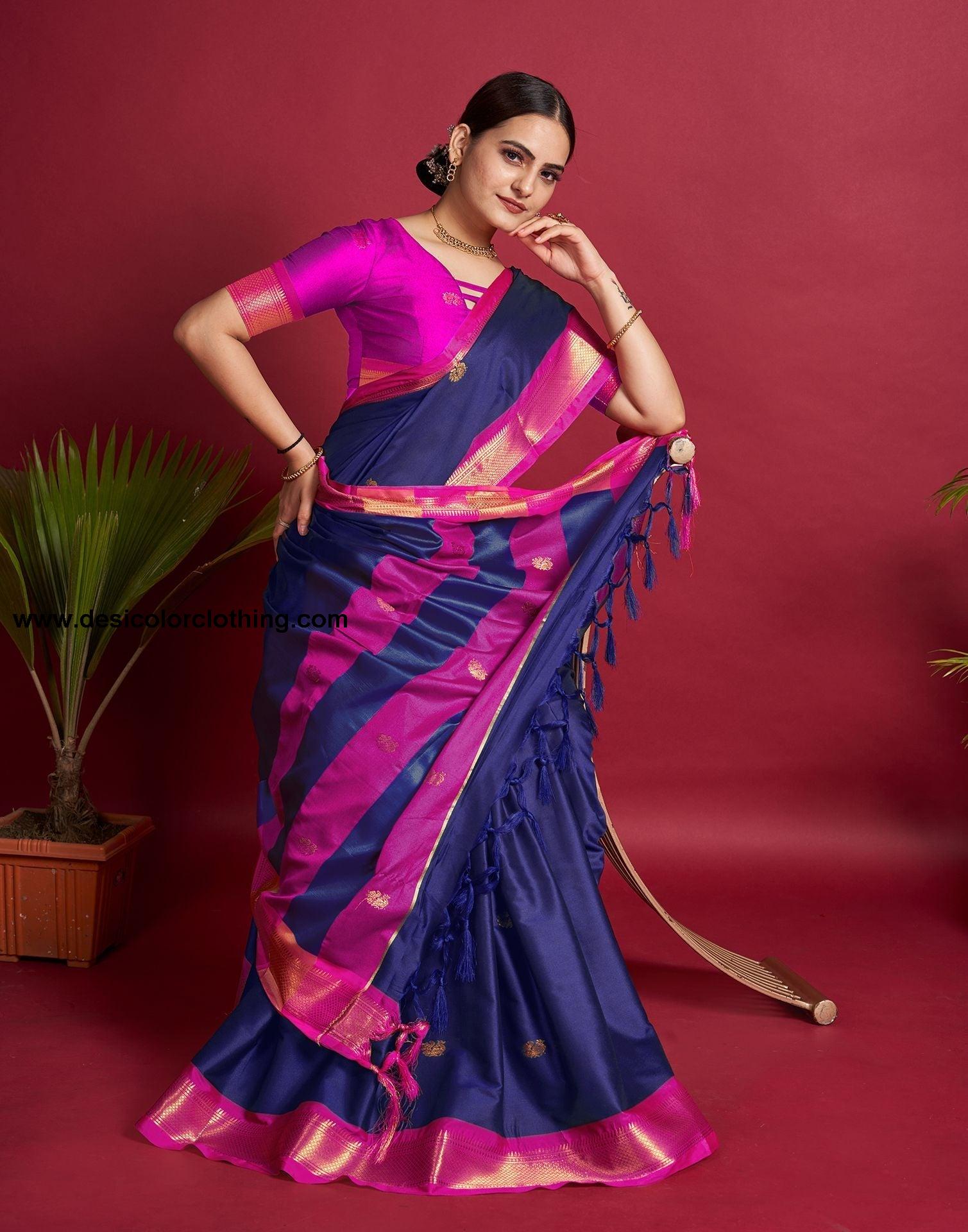 Blouse Color:Pink Blouse Fabric:Cotton Silk Blouse Length:0.80 Mtr Blouse Work:Plain, Jacquard Saree Color:Dark Blue Saree Fabric:Cotton Silk Saree Length:5.50 Mtr Saree Work:Jacquard, Tassels