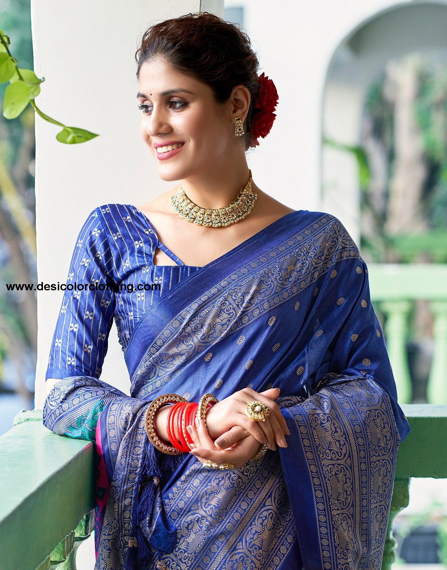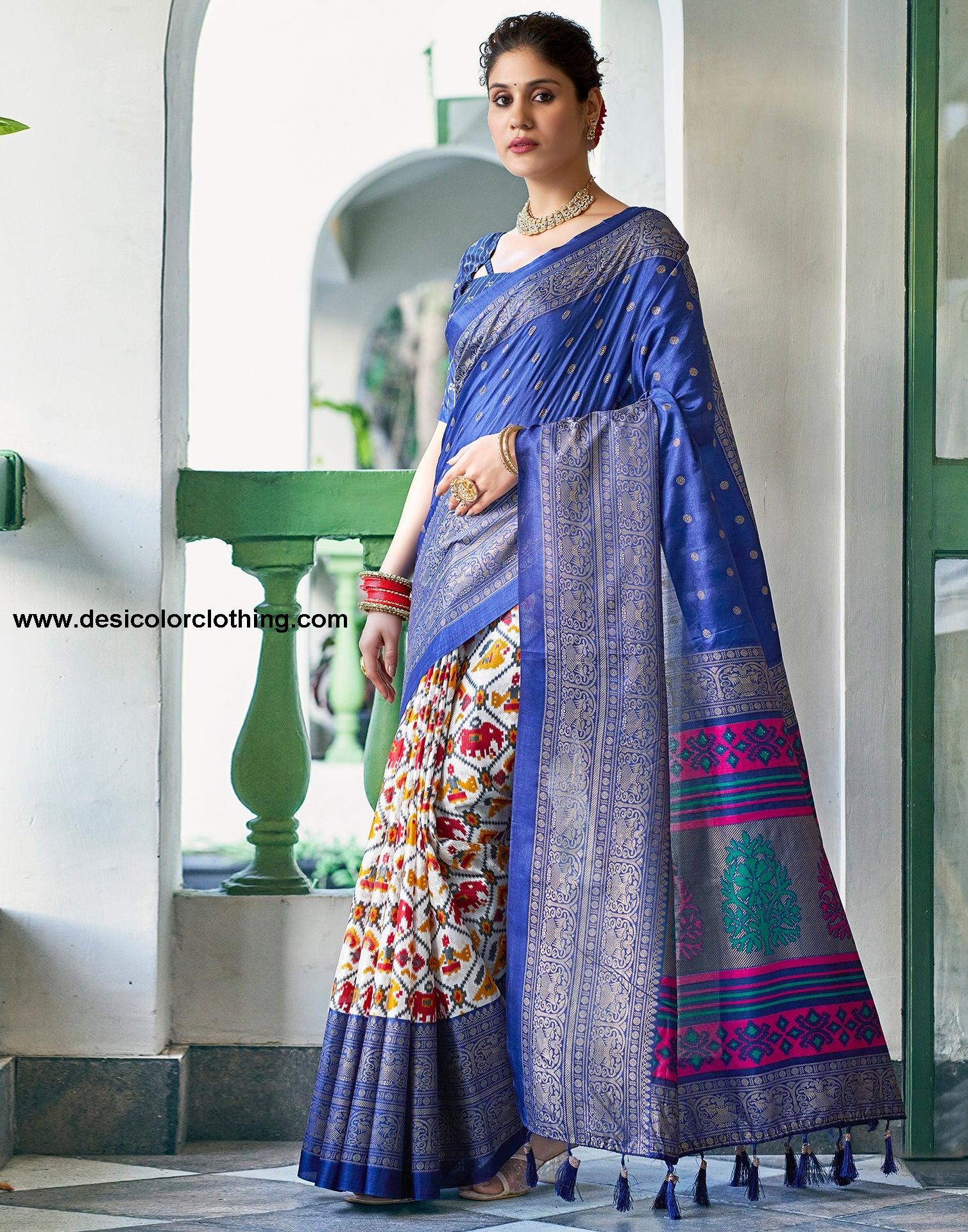 Blouse Color:Dark Blue, Golden Blouse Fabric:Plain Blouse Length:0.80 Mtr Blouse Work:Plain, Foil Printed Saree Color:Dark Blue, White, Multicoloured Saree Fabric:Dola Silk Saree Length:5.50 Mtr Saree Work:Printed