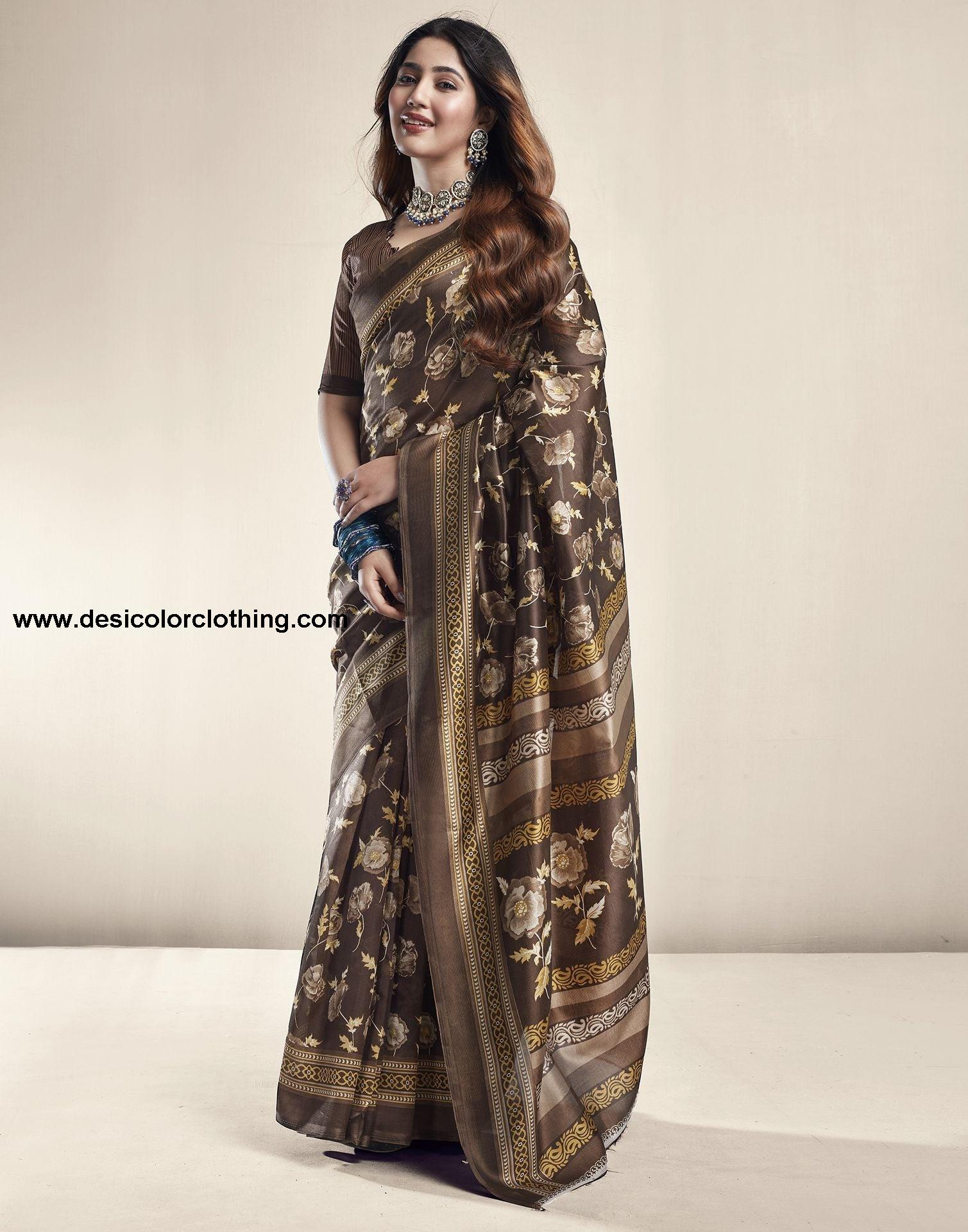 Blouse Color:Brown Blouse Fabric:Poly Silk Blouse Length:0.70 Mtr Blouse Work:Printed Saree Color:Dark Brown, Beige Saree Fabric:Poly Silk Saree Length:5.30 Mtr Saree Work:Floral Printed