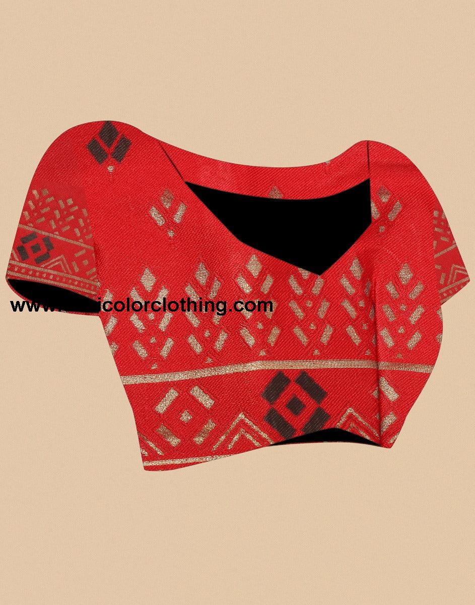 Blouse Color:Red Blouse Fabric:Polyester Blend Blouse Length:0.80 Mtr Blouse Work:Jacquard Saree Color:Dark Brown Saree Fabric:Poly Silk Saree Length:5.50 Mtr Saree Work:Jacquard Lace, Foil Print (Jari Work) Type:Printed