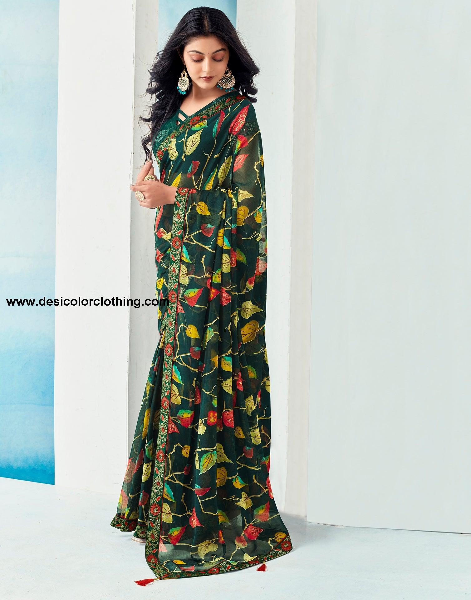 Dark Green Chiffon Printed Saree