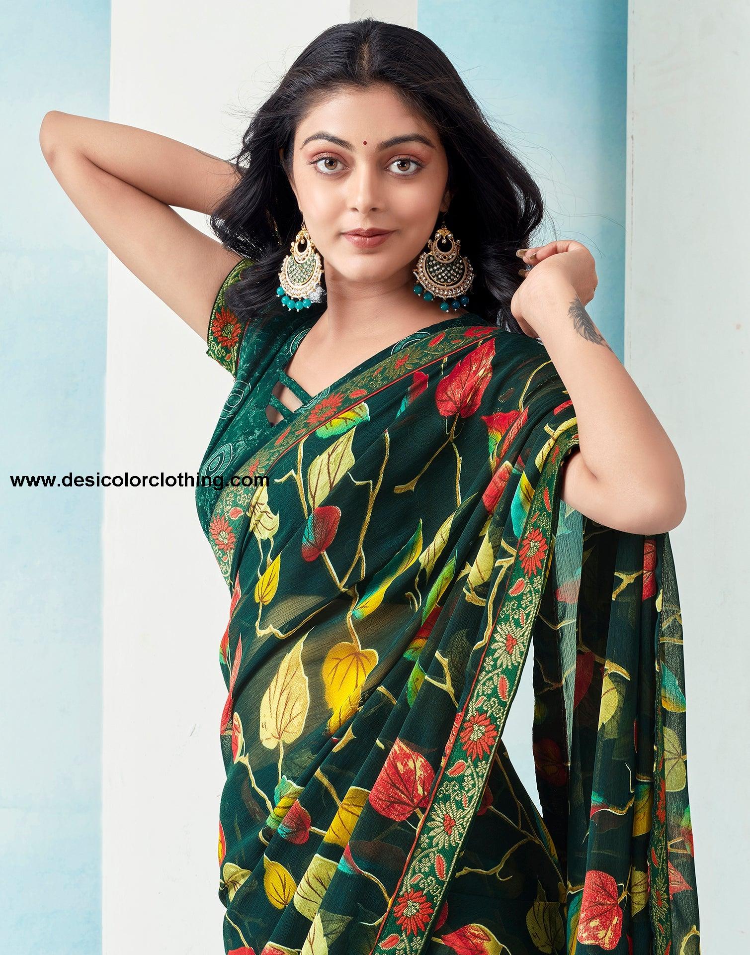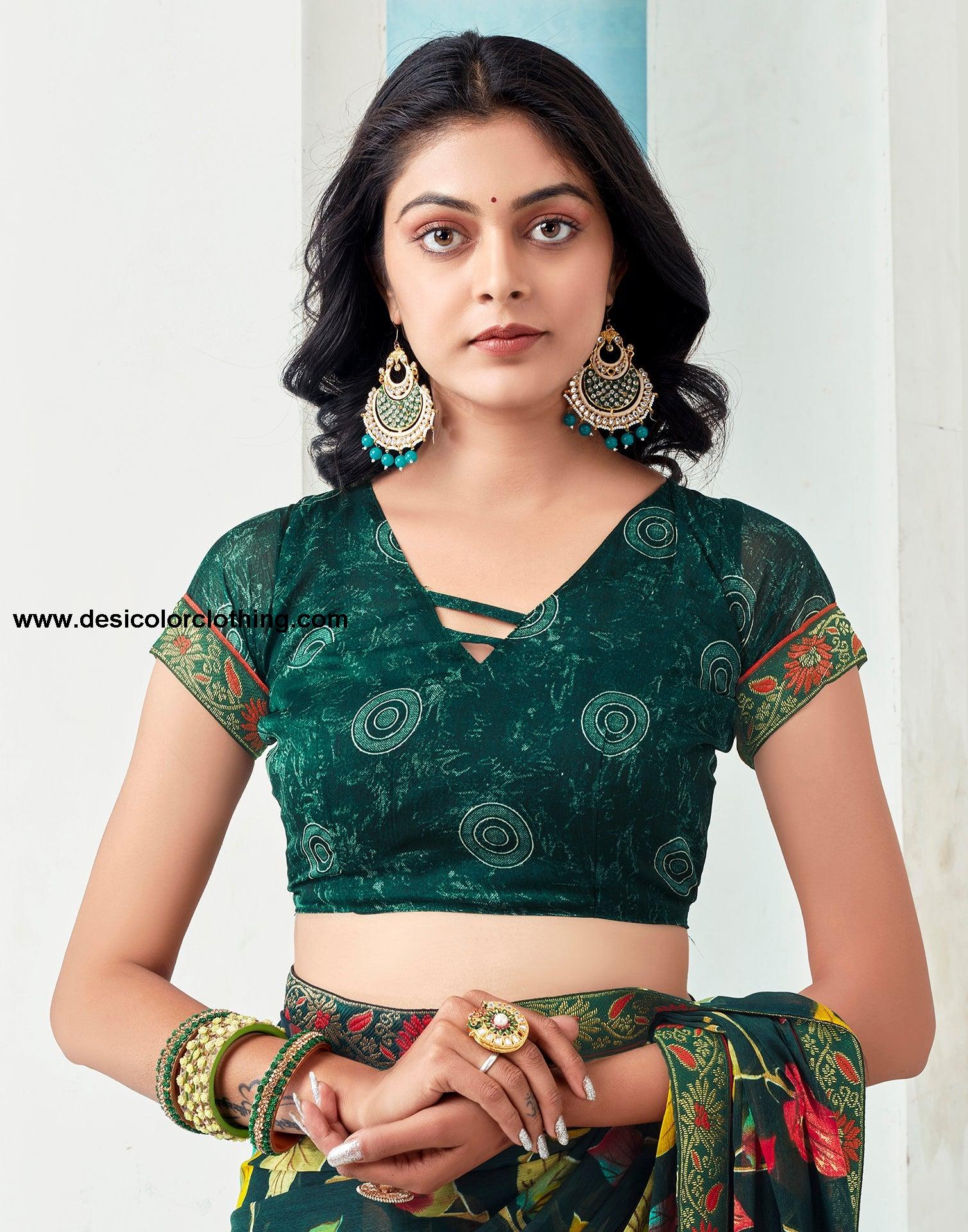 Blouse Color:Dark Green Blouse Fabric:Printed Blouse Length:0.70 Mtr Blouse Work:Printed Saree Color:Dark Green Saree Fabric:Chiffon Saree Length:5.30 Mtr Saree Work:Printed
