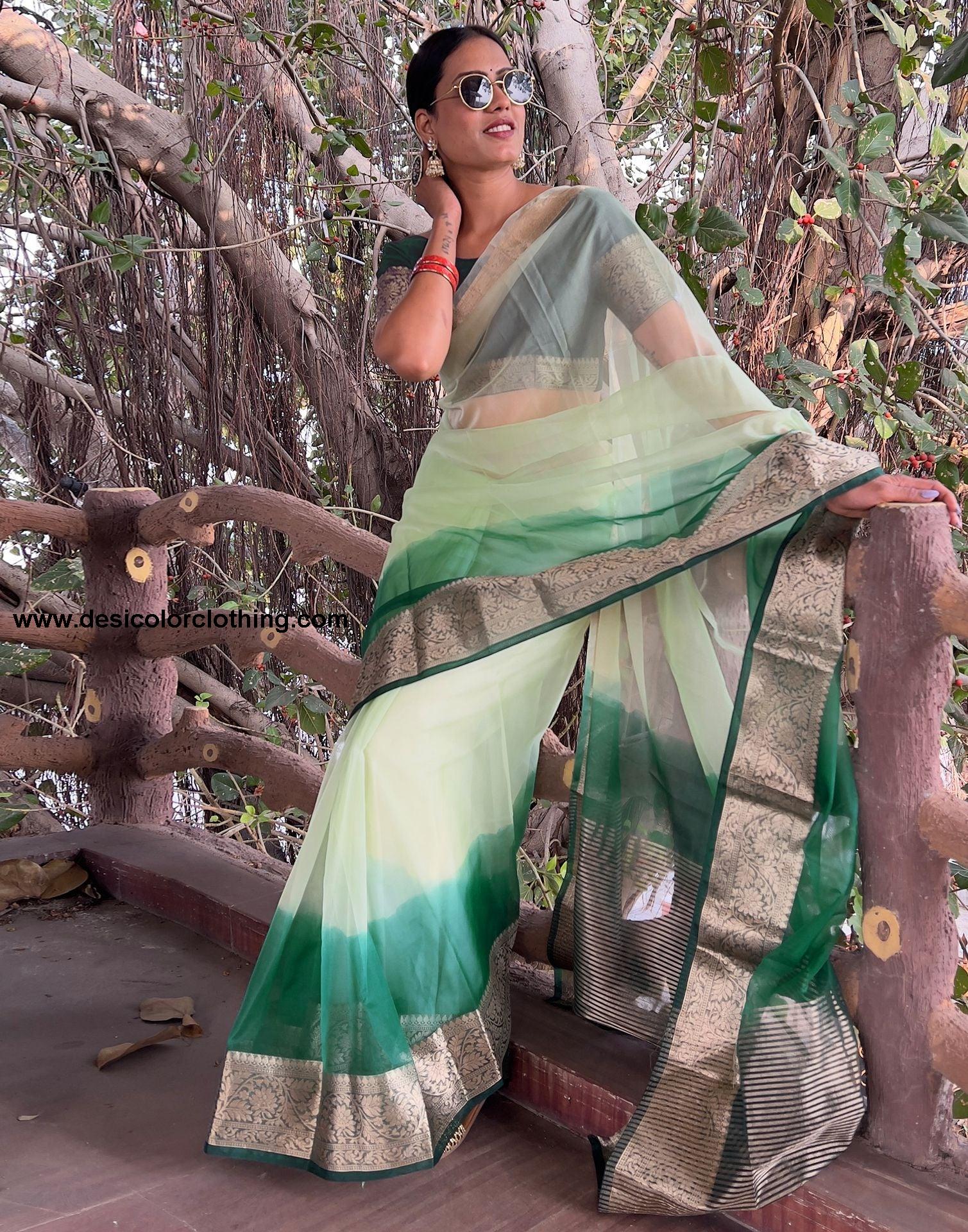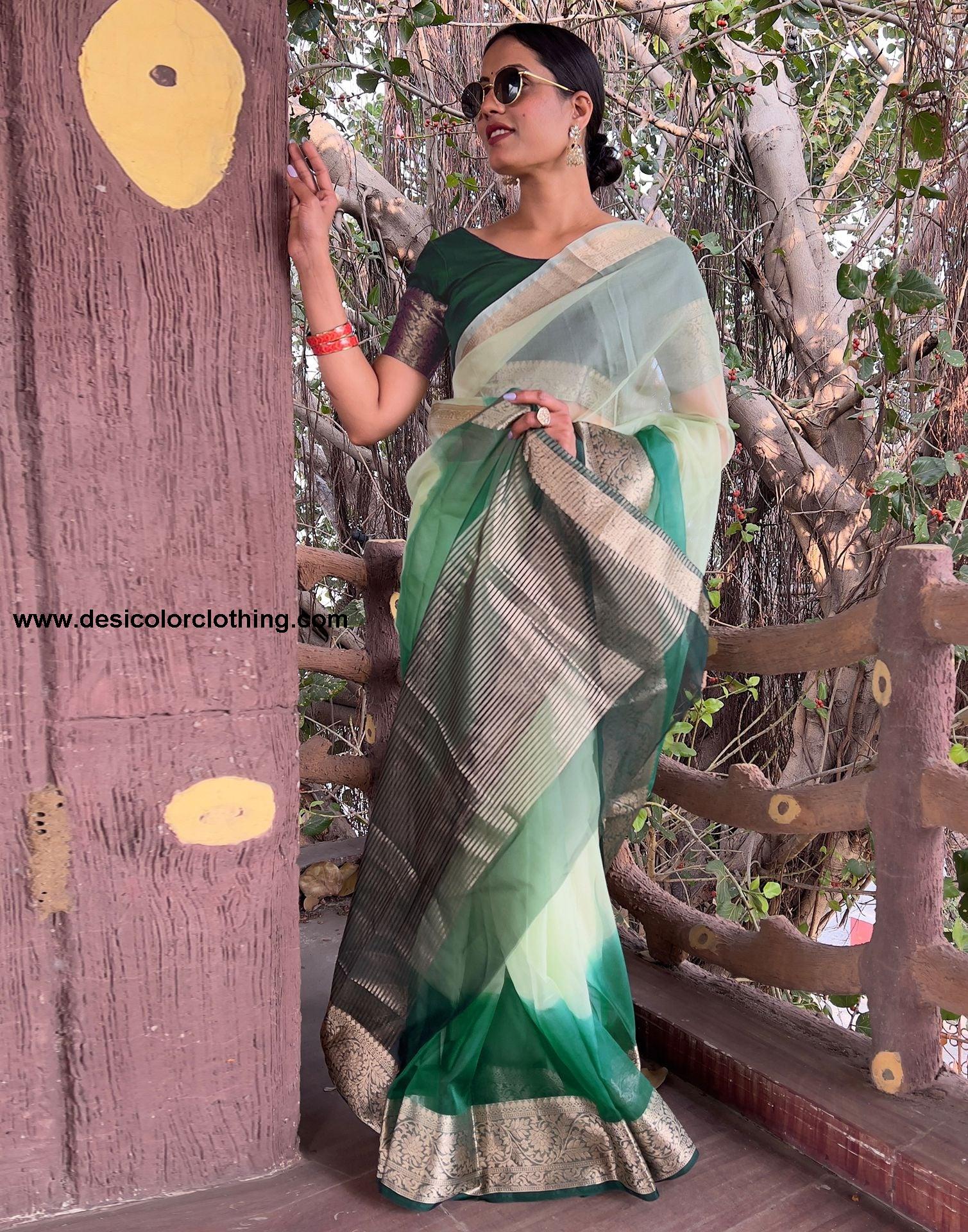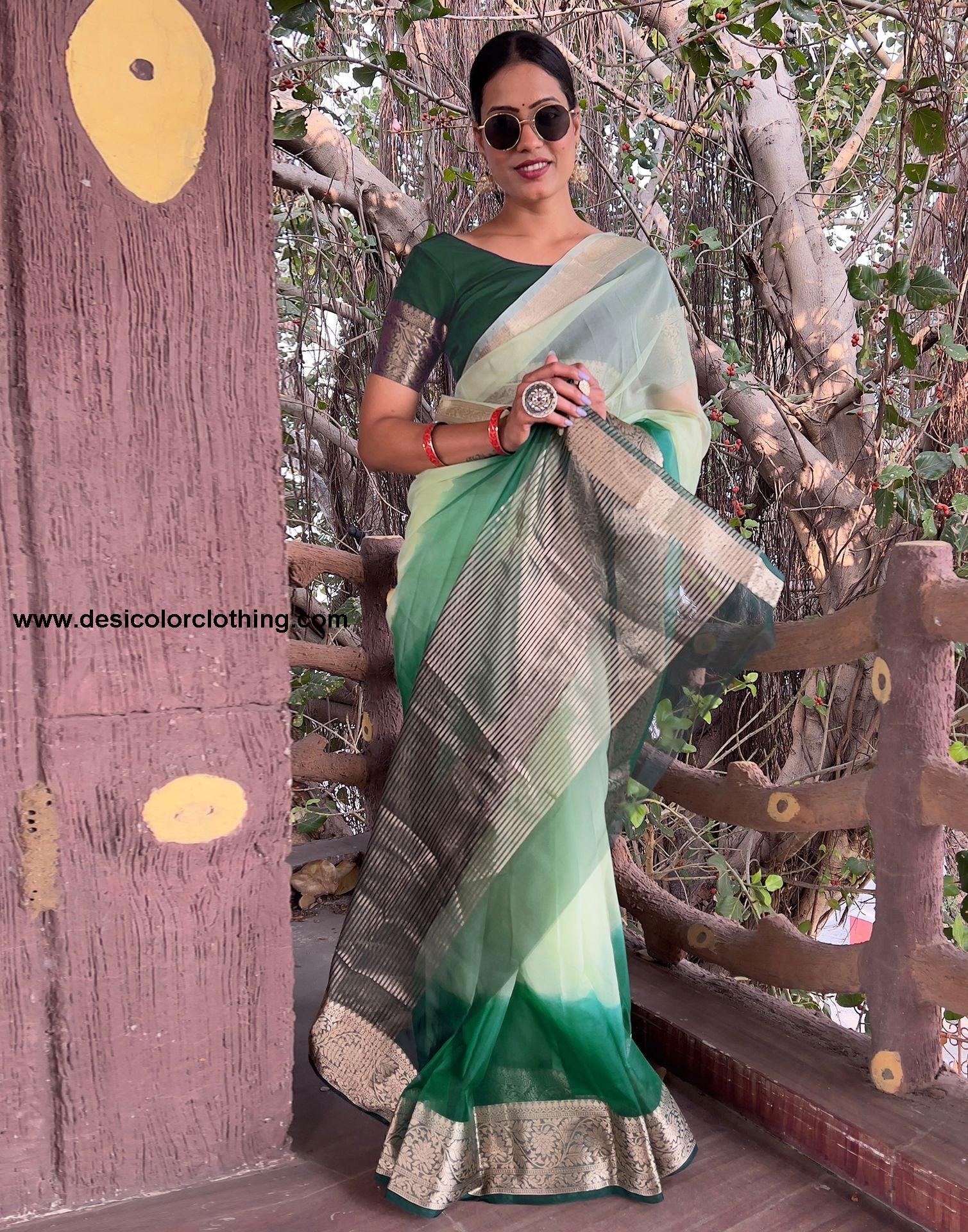 Blouse Color:Dark Green Blouse Fabric:Organza Blouse Length:0.90 Mtr Blouse Work:Plain, Jacquard Border Saree Color:Dark Green, Light Green Saree Fabric:Organza Saree Length:5.50 Mtr Saree Work:Dyed, Jacquard Border