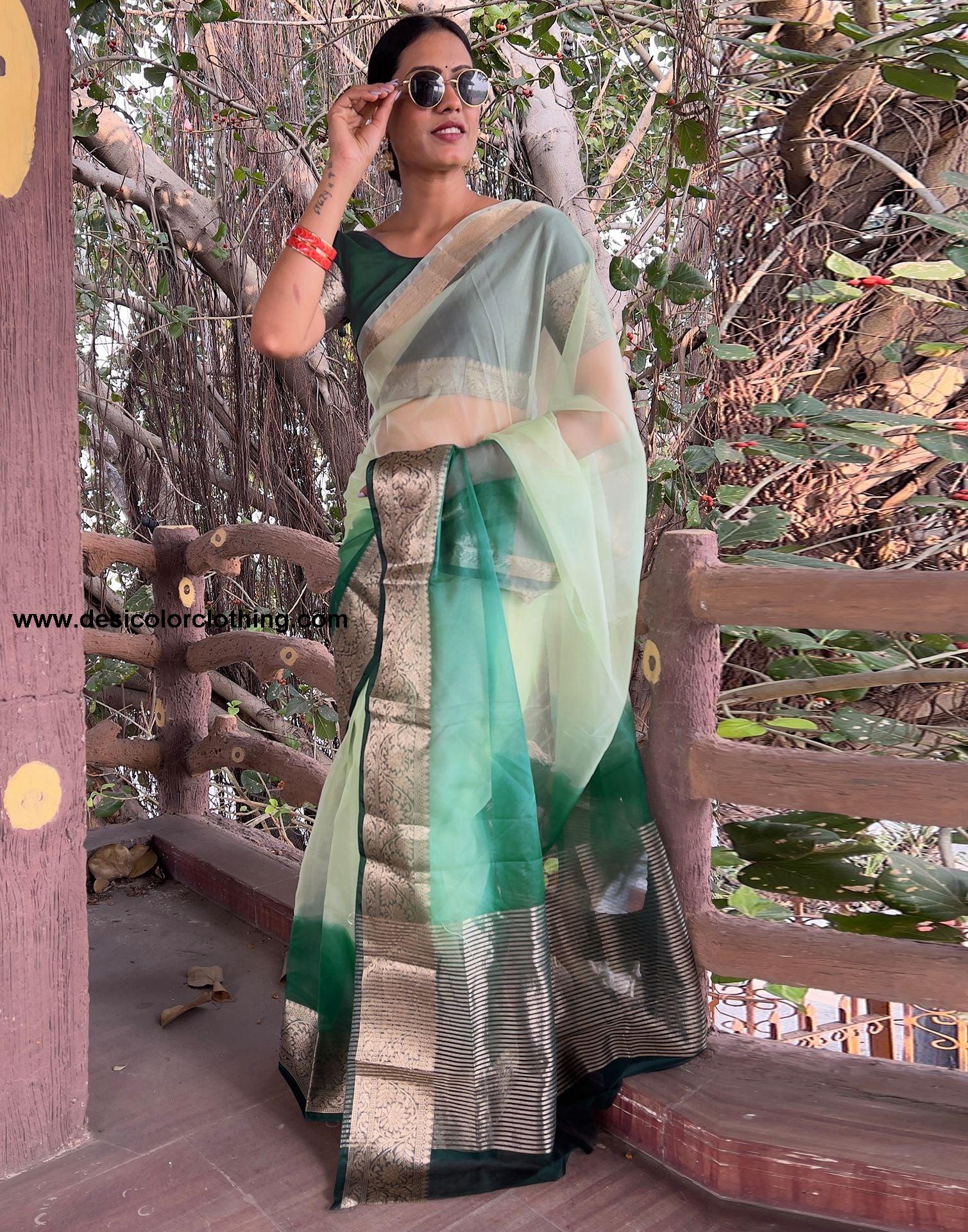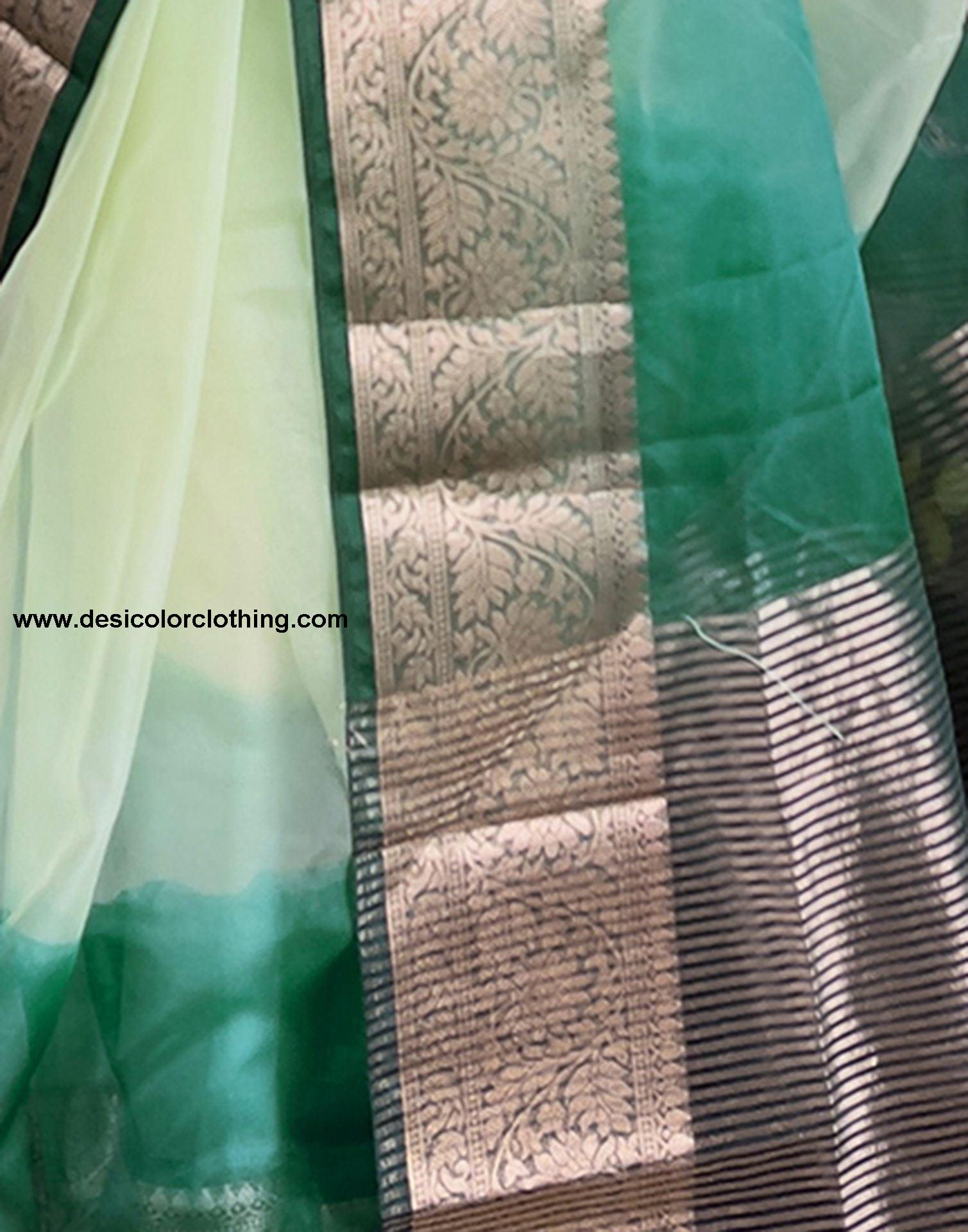 Blouse Color:Dark Green Blouse Fabric:Organza Blouse Length:0.90 Mtr Blouse Work:Plain, Jacquard Border Saree Color:Dark Green, Light Green Saree Fabric:Organza Saree Length:5.50 Mtr Saree Work:Dyed, Jacquard Border