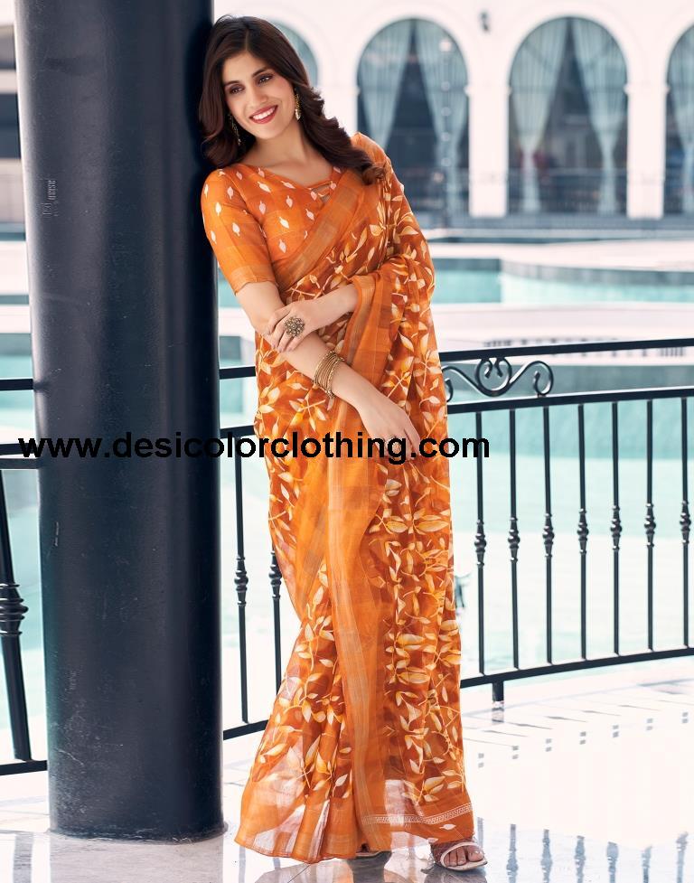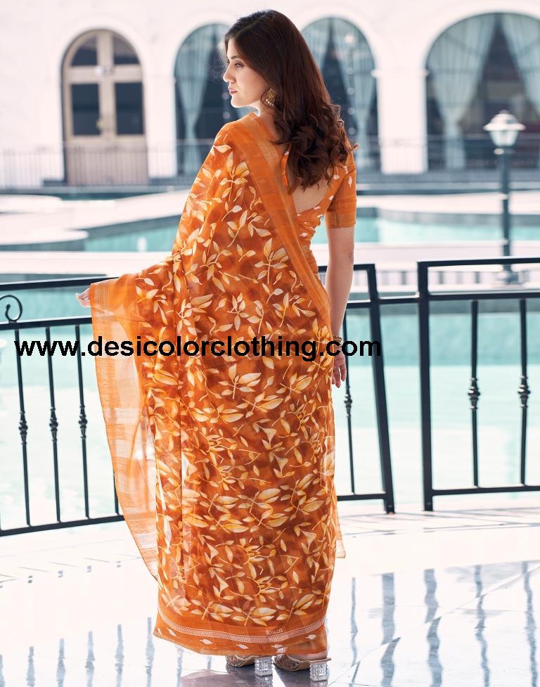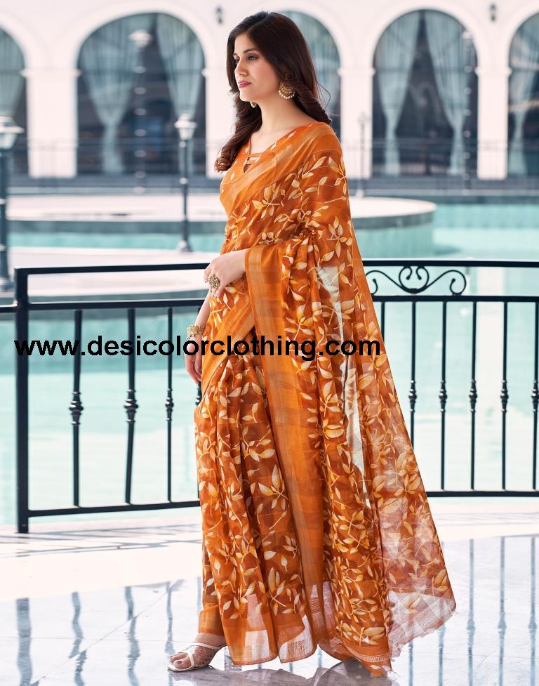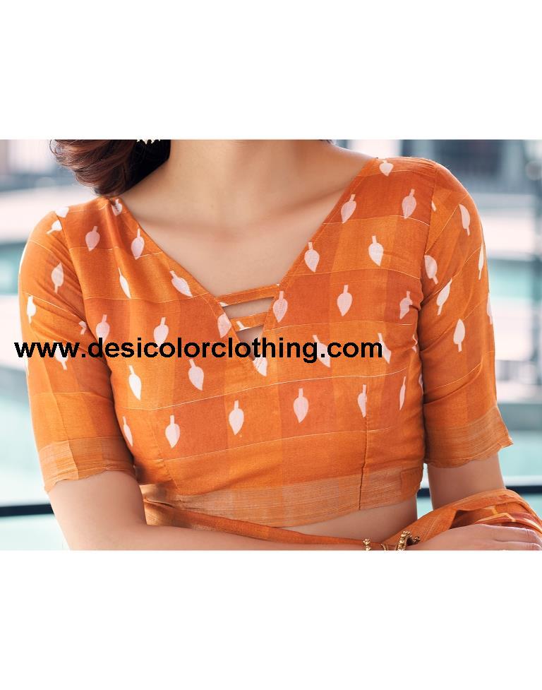 Blouse Color:Dark Orange Blouse Fabric:Poly Cotton Blouse Length:0.70 Mtr Blouse Work:Floral Printed, Woven Zari Stripe, Zari Border Saree Color:Dark Orange Saree Fabric:Poly Cotton Saree Length:5.30 Mtr Saree Work:Floral Printed, Woven Zari Stripe, Zari Border