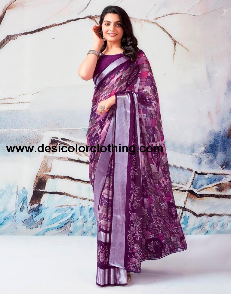 Blouse Color:Dark Purple Blouse Fabric:Chiffon Blouse Length:0.80 Mtr Blouse Work:Plain, Woven Silver Border Saree Color:Dark Purple, Pink, Multi Saree Fabric:Chiffon Saree Length:5.50 Mtr Saree Work:Printed, Woven Silver Border
