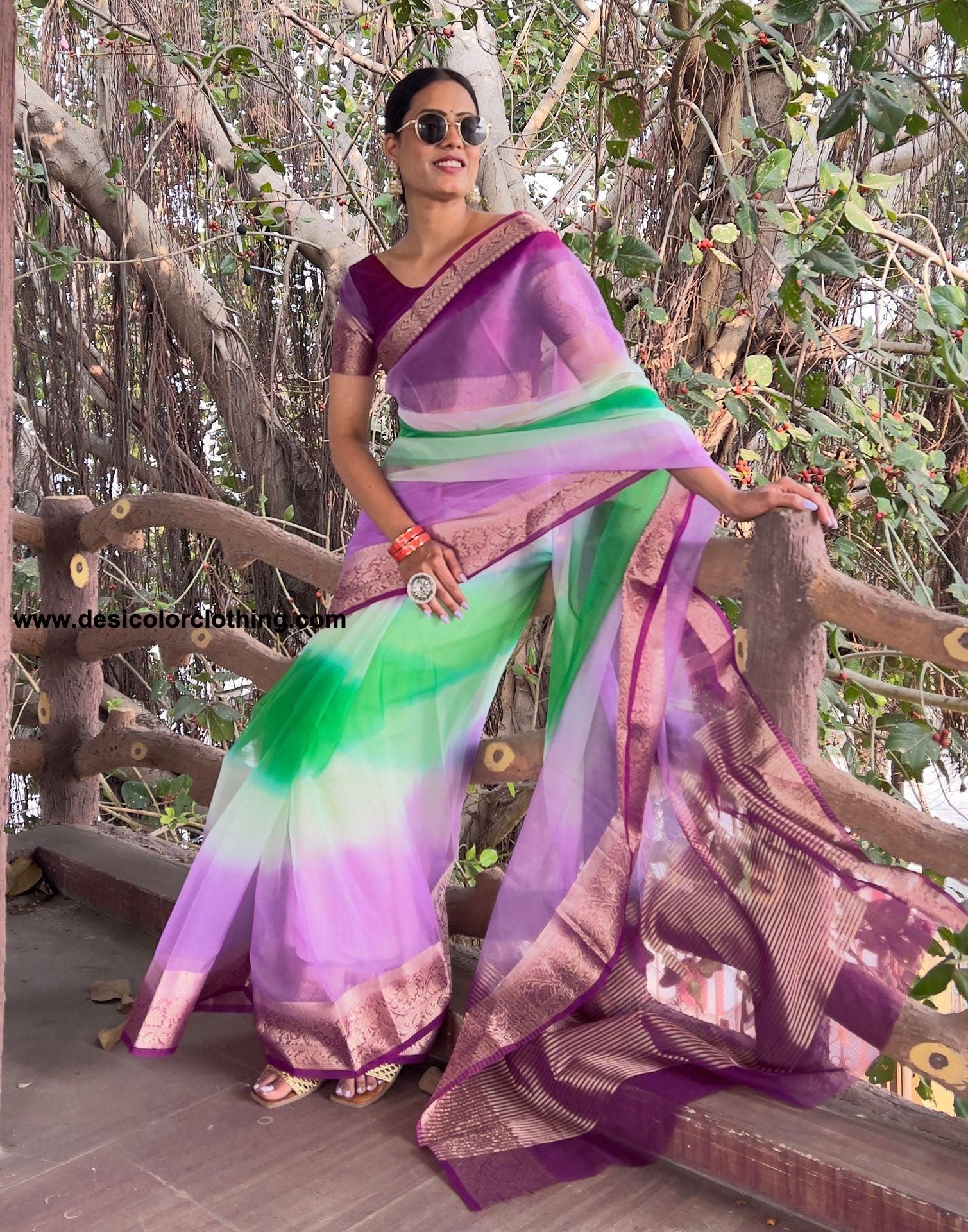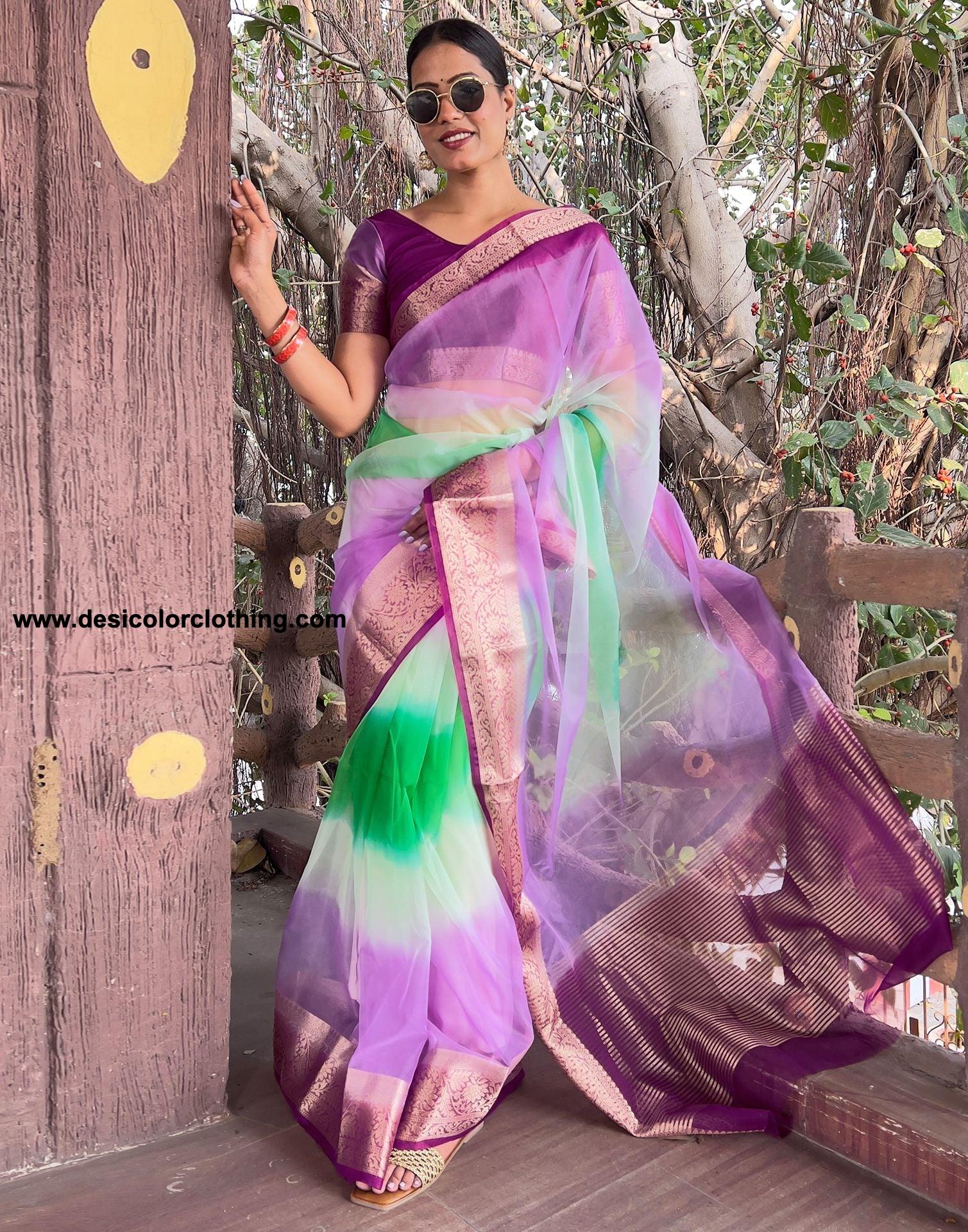 Blouse Color:Dark Purple Blouse Fabric:Organza Blouse Length:0.90 Mtr Blouse Work:Plain, Jacquard Border Saree Color:Dark Purple, Lavender, Green Saree Fabric:Organza Saree Length:5.50 Mtr Saree Work:Dyed, Jacquard Border
