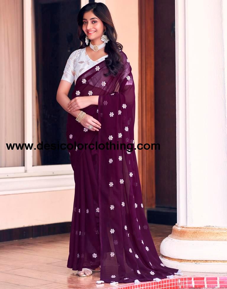 Blouse Color:White Blouse Fabric:Benglori Silk Blouse Length:0.80 Mtr Blouse Work:Embroidery Saree Color:Deep Purple Saree Fabric:Georgette Saree Length:5.50 Mtr Saree Work:Plain, Embroidery, Tassels