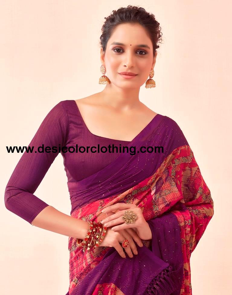 Blouse Color:Deep Purple Blouse Fabric:Banglori Silk Blouse Length:0.80 Mtr Blouse Work:Plain Saree Color:Deep Purple, Pink, Multicoloured Saree Fabric:Georgette Saree Length:5.50 Mtr Saree Work:Printed