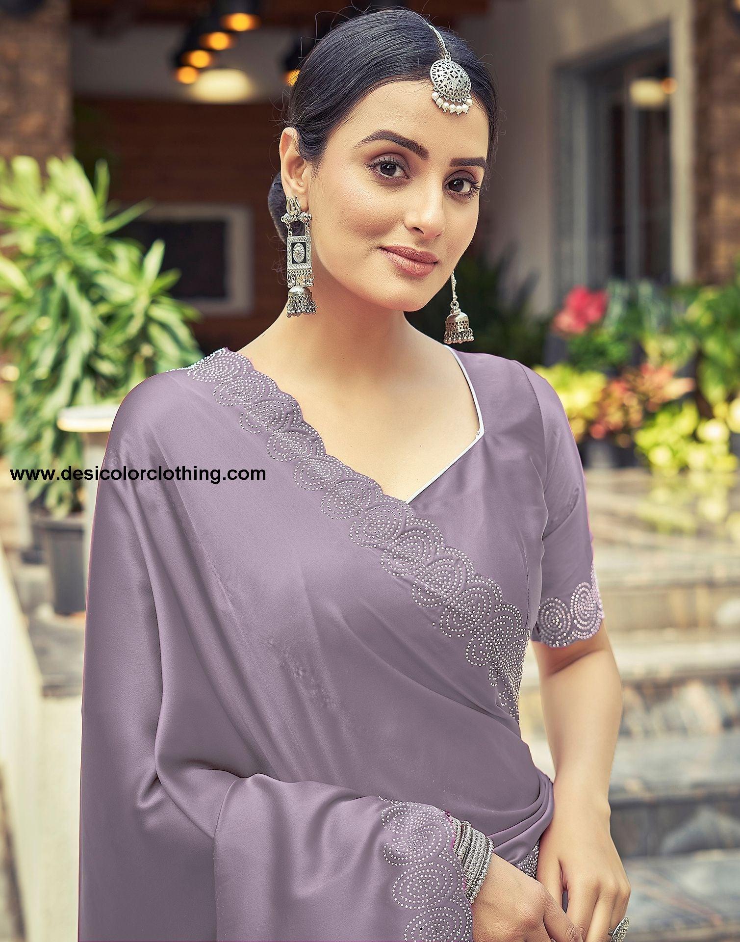 Blouse Color:Dull Light Purple Blouse Fabric:Satin Silk Blouse Length:0.80 Mtr Blouse Work:Plain, Stone Work Border Saree Color:Dull Light Purple Saree Fabric:Satin Silk Saree Length:5.40 Mtr Saree Work:Dyed, Stone Work Border