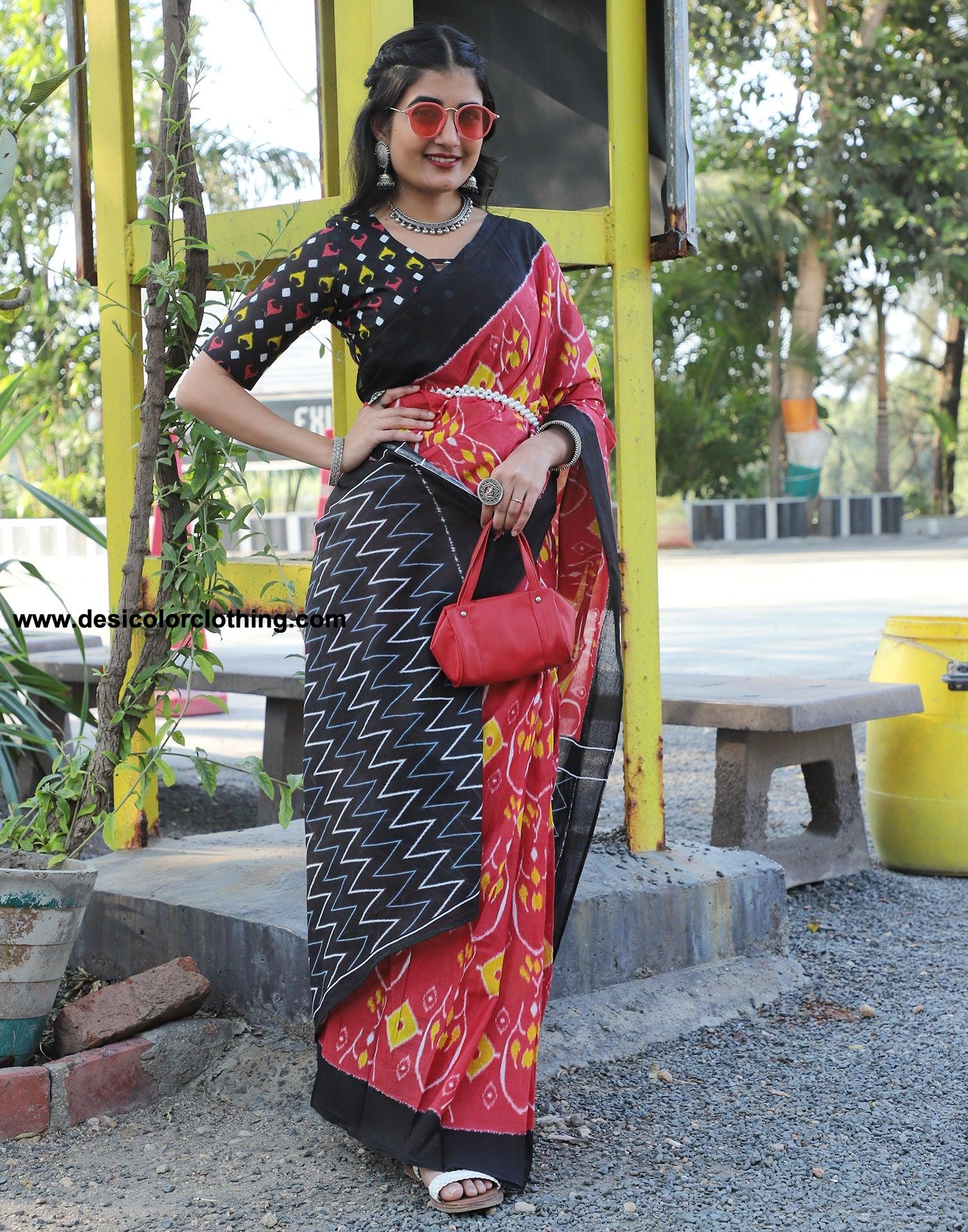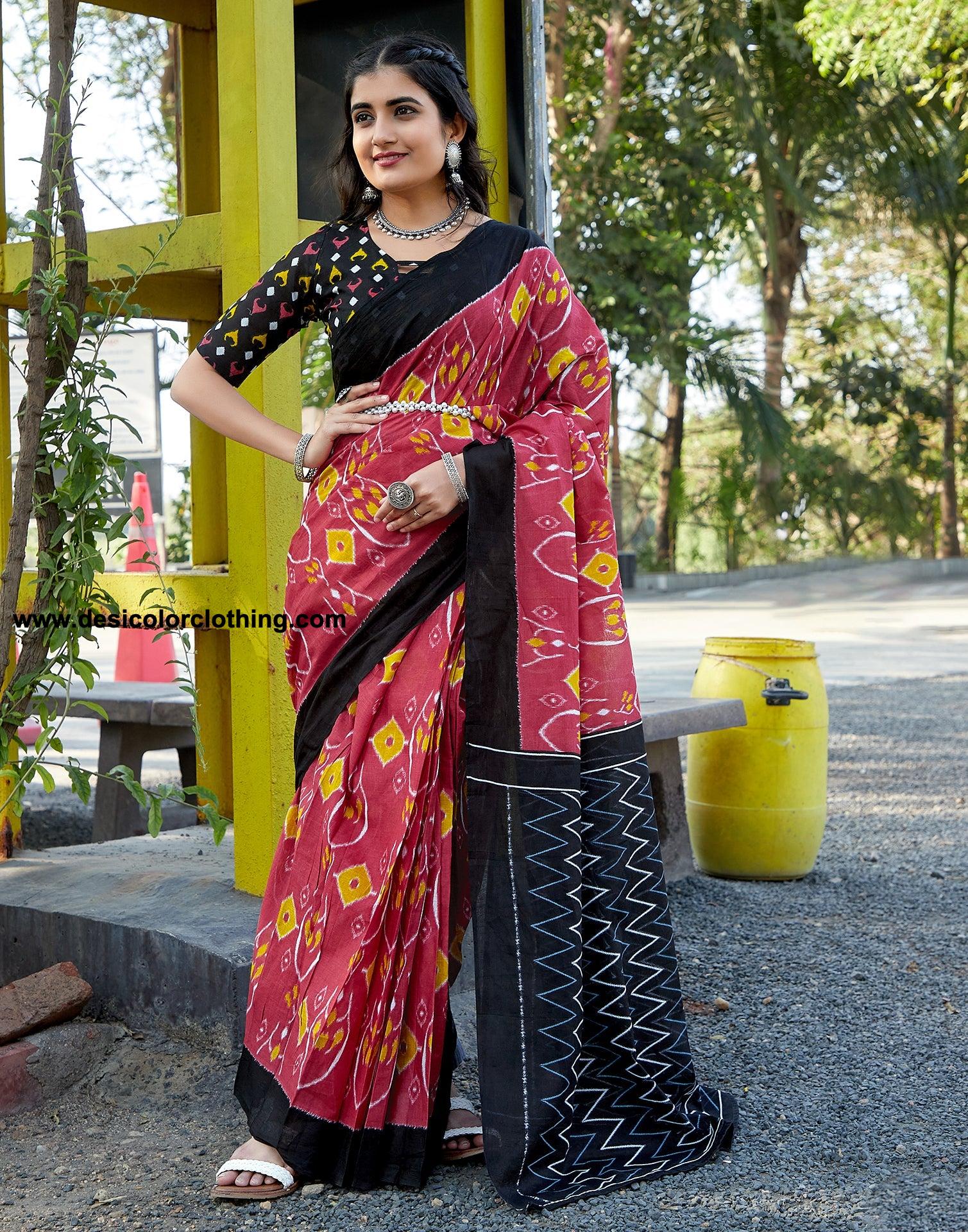Blouse Color:Black, Multi Blouse Fabric:Printed Blouse Length:0.80 Mtr Blouse Work:Printed Saree Color:Dusty Red, Black Saree Fabric:Cotton Saree Length:5.50 Mtr Saree Work:Printed