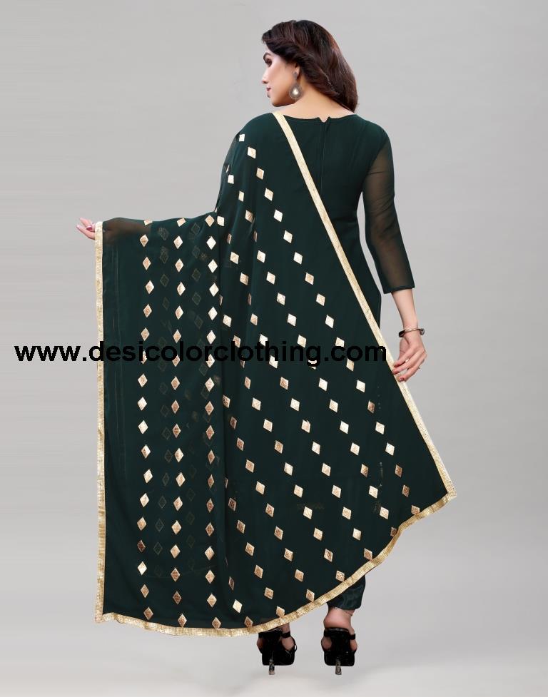 Bottom Color:Dark Green Bottom Fabric:Raw Silk Bottom Length:2 Mtr Bottom Work:Sequence Work, Lace Dupatta Color:Dark Green Dupatta Fabric:Georgette Dupatta Length:2 Mtr Top Color:Dark Green Top Fabric:Georgette Top Length:2.10 Mtr Top Work:Sequence Work, Lace