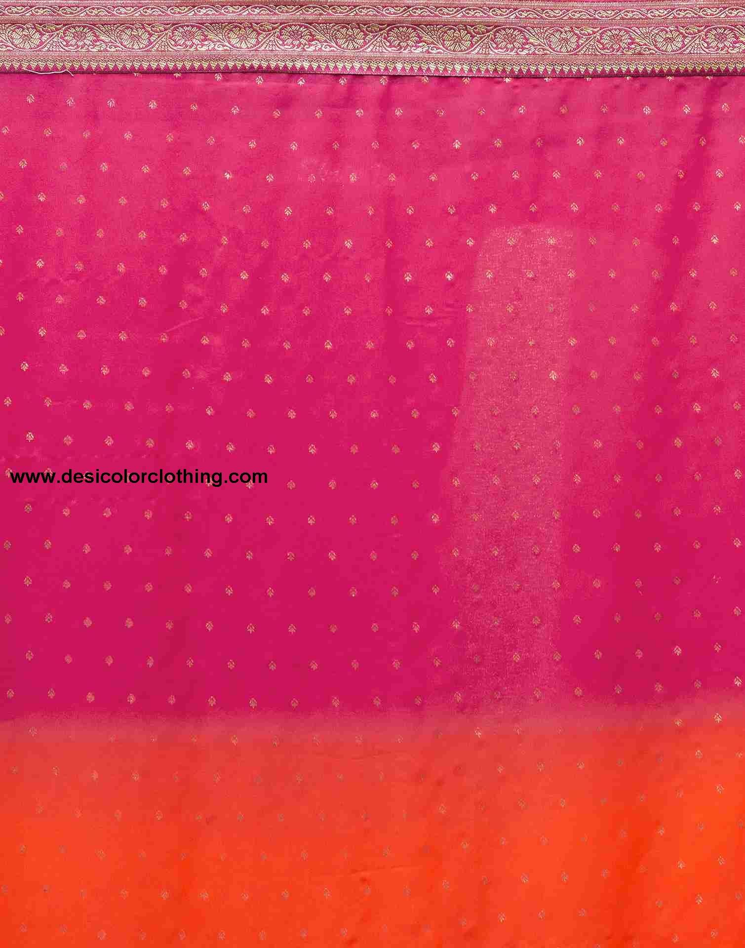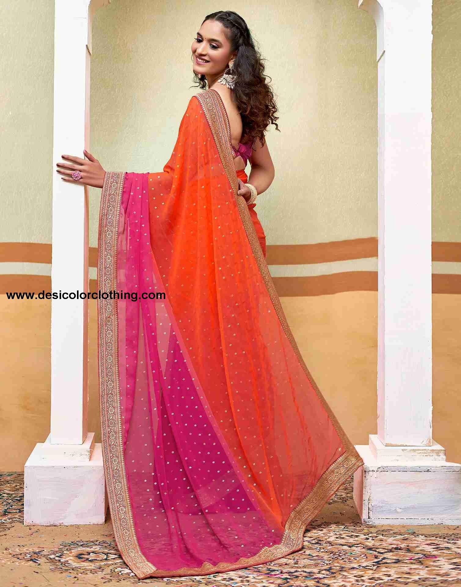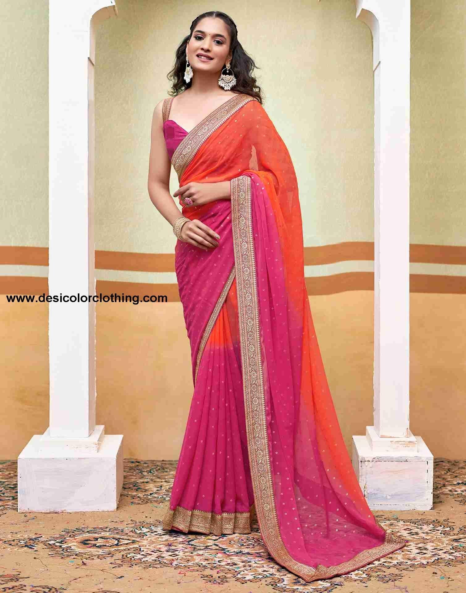 Blouse Color:Pink Blouse Fabric:Georgette Blouse Length:0.70 Mtr Blouse Work:Woven, Lace Saree Color:Orange, Pink Saree Fabric:Georgette Saree Length:5.30 Mtr Saree Work:Plain(Padding), Foil Printed, Lace