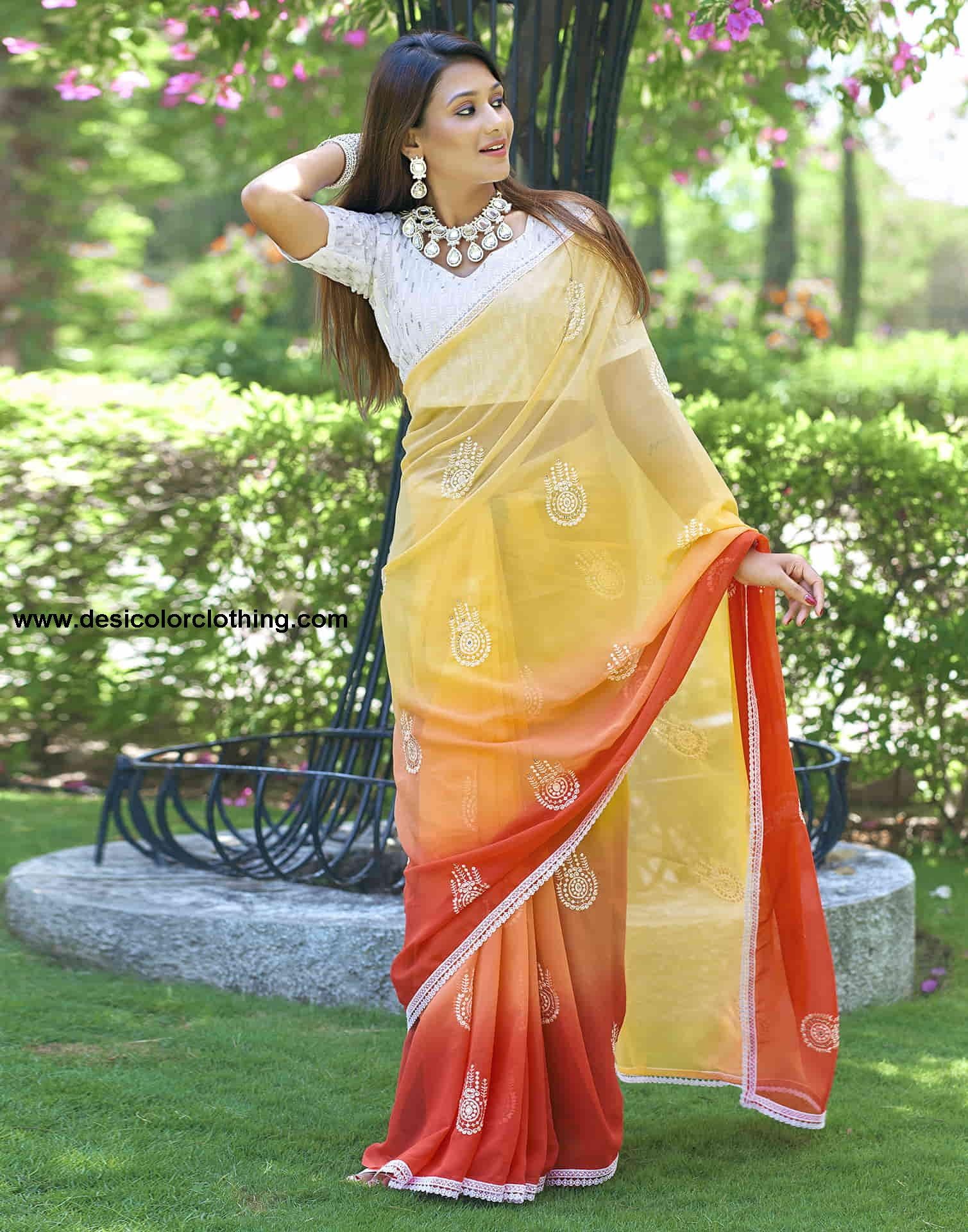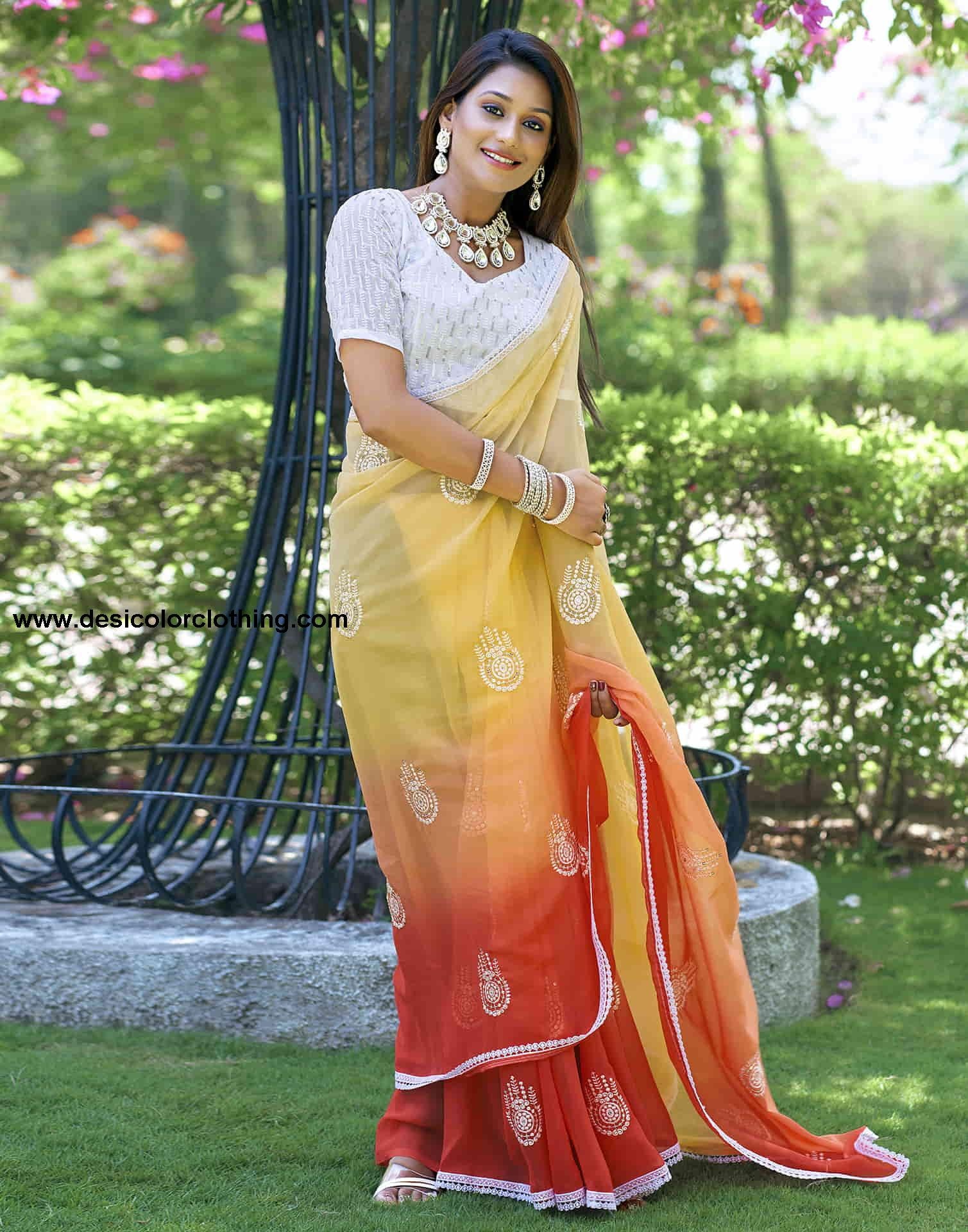 Saree Color:Orange, Yellow, White Type:Embellished